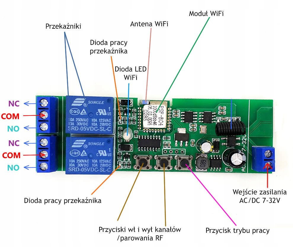 - "NC": Normally closed relay - normalnie zamknięty"COM": Common - wspólne"NO": Normalny open - normalnie otwarty