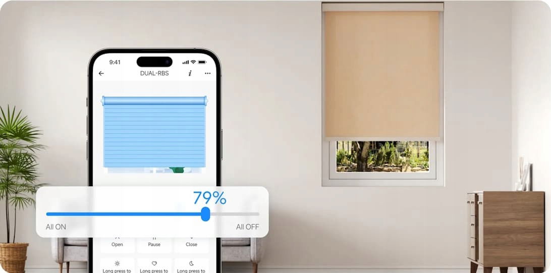 Przełącznik pozwala na precyzyjne sterowanie roletami w procentach. System automatycznie kalibruje zakres ruchu silnika, zapewniając idealne pozycjonowanie.