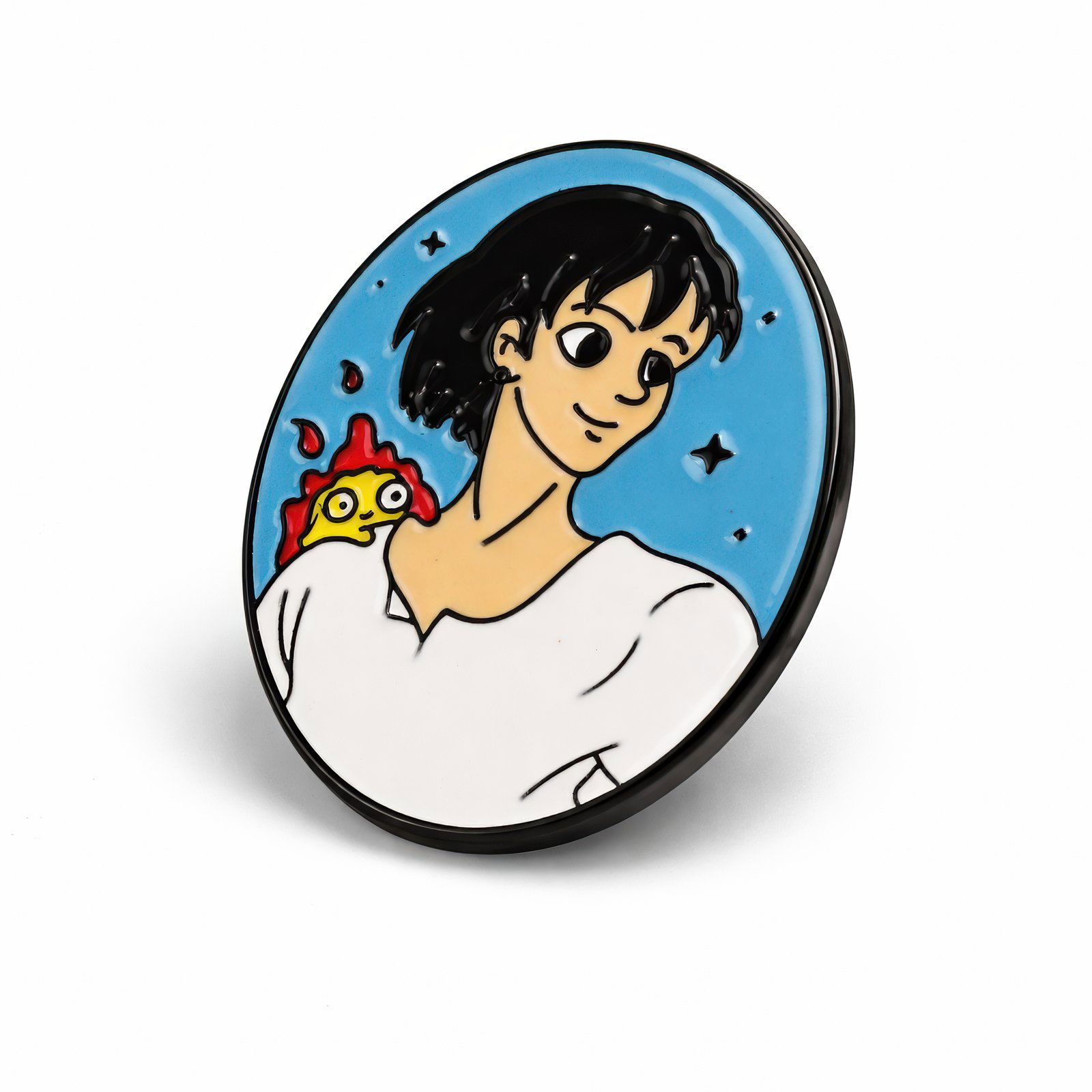 This 4cm metal enamel pin celebrates the enchanting world of Howl's Moving Castle, featuring Sophie with Calcifer perched on her shoulder. Set against a starry blue backdrop, the vivid design captures their enduring bond with smooth enamel detailing and bold colors. Crafted for fans of Studio Ghibli’s iconic tale, this durable pin showcases precise artistry and a classic silhouette—ideal for adorning jackets, bags, or collections while honoring the film’s timeless magic.