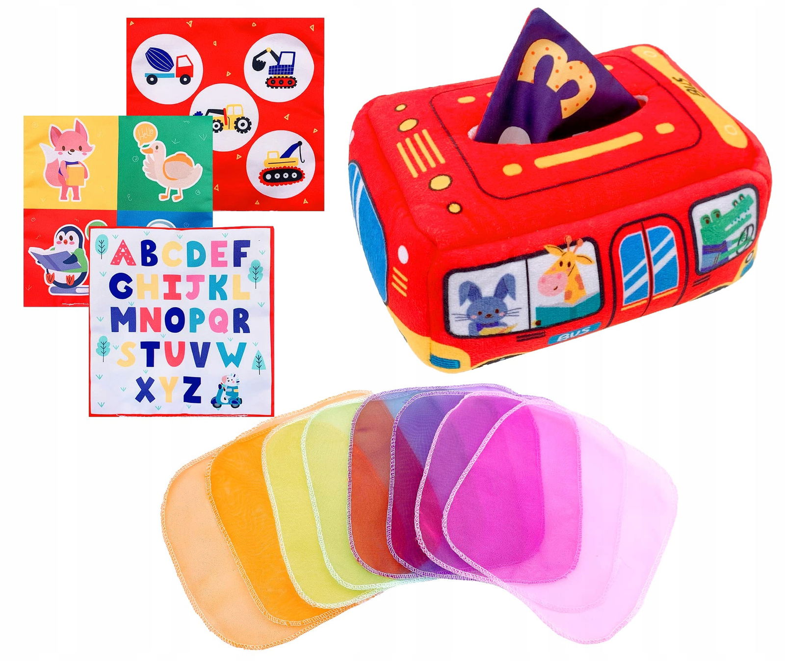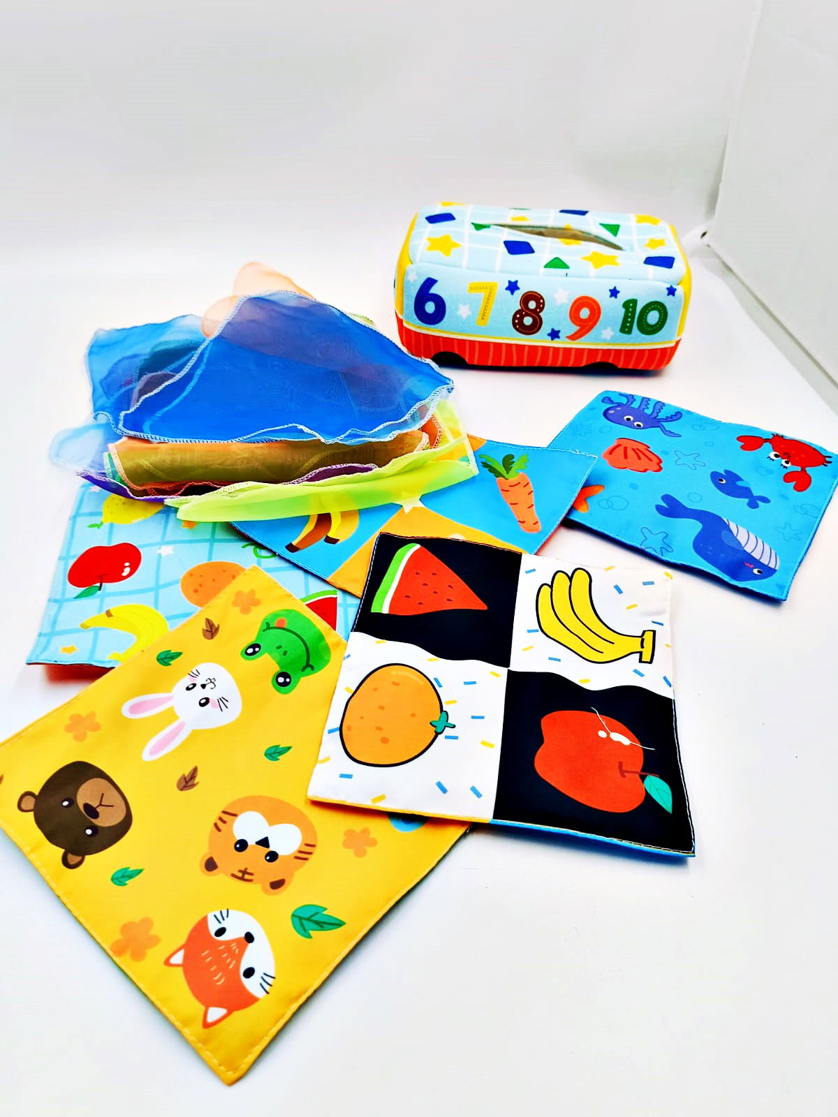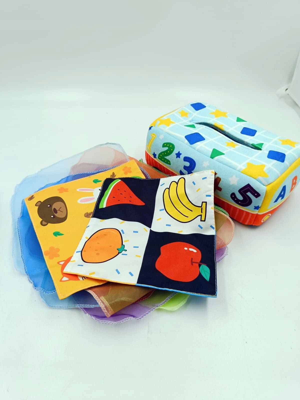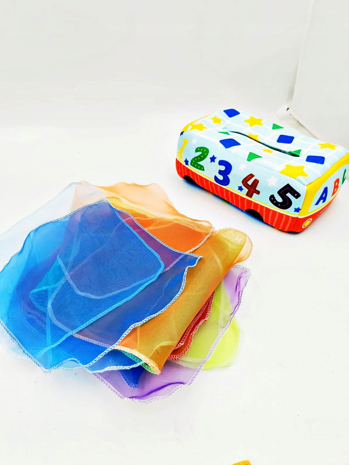 ✔ Sensoryczne doświadczenie – Chusteczki wykonane z delikatnych, kolorowych materiałów, które stymulują dotyk i wzrok dziecka.