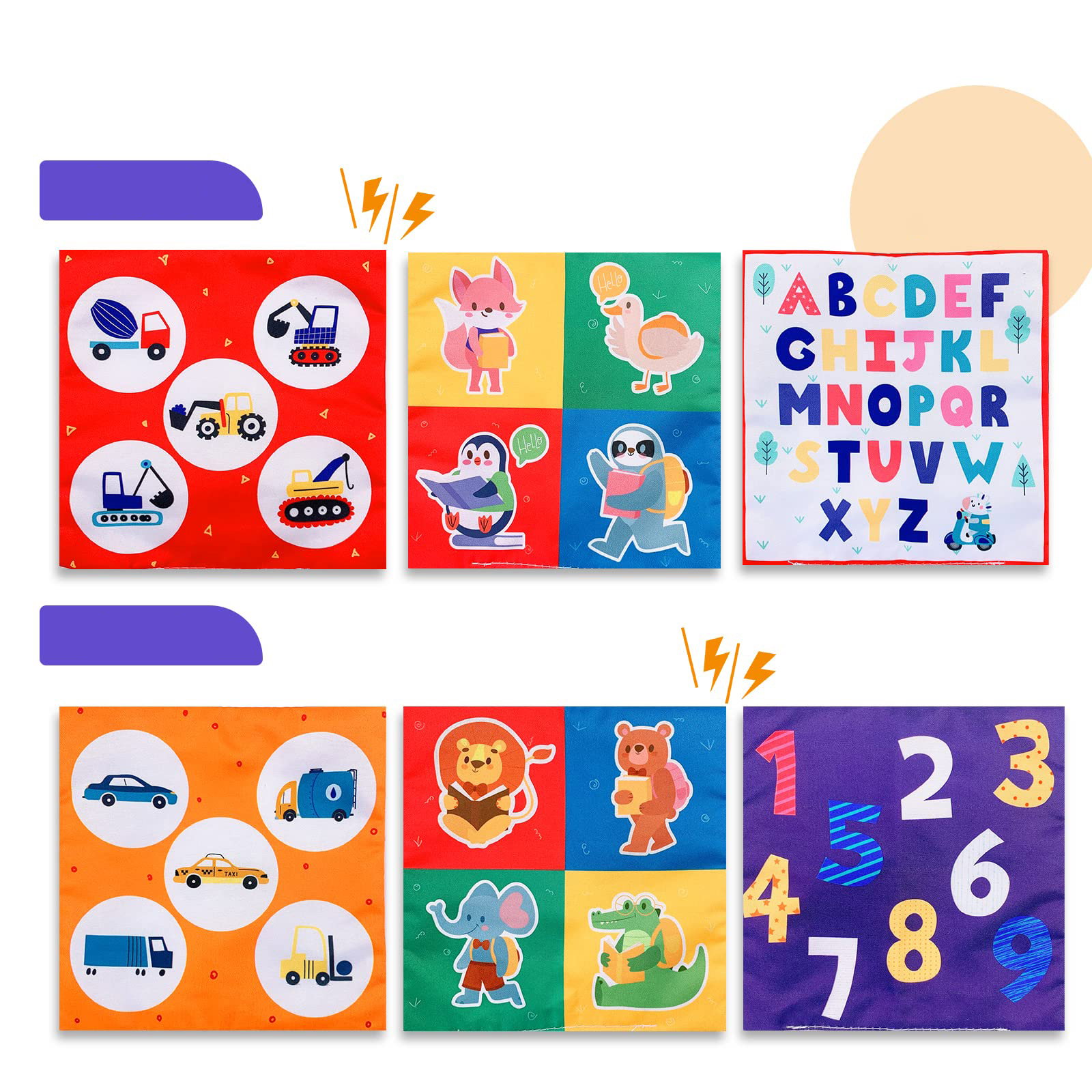 - 5 materiałowych kart edukacyjnych z ilustracjami zwierząt, owoców i innych motywów.