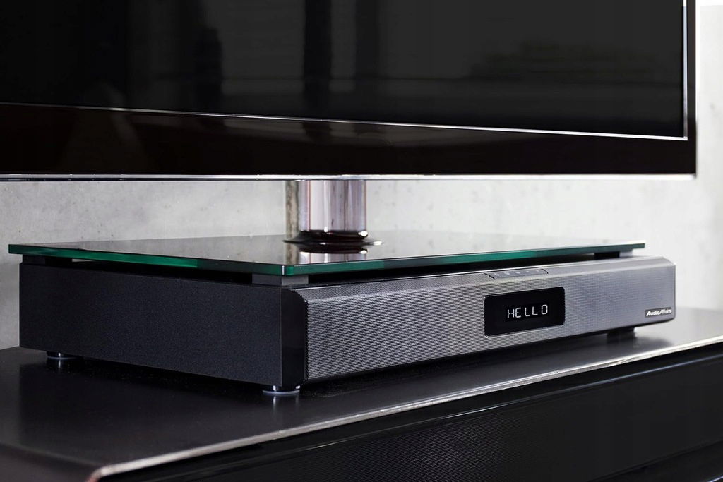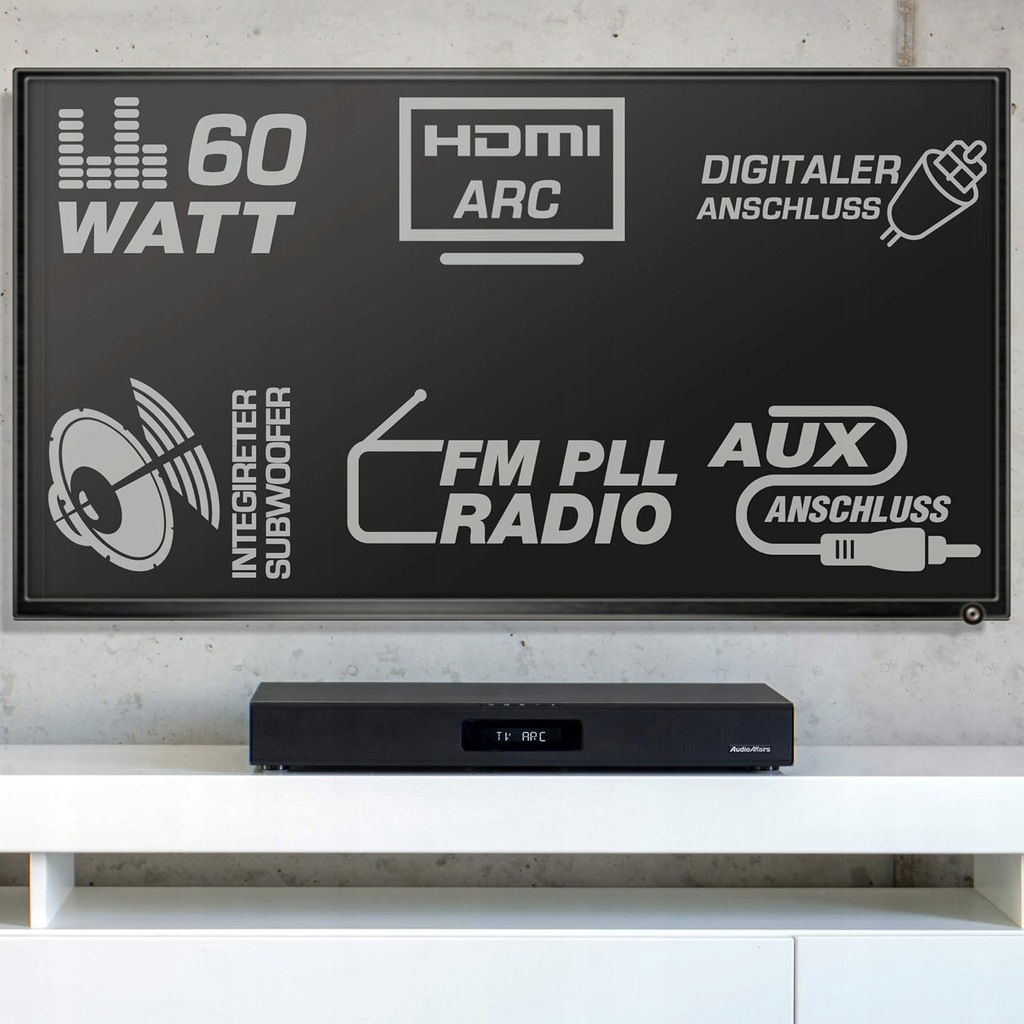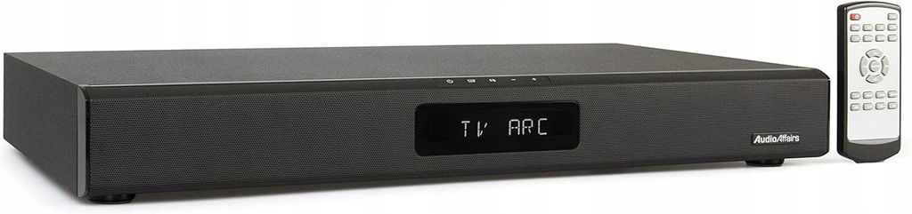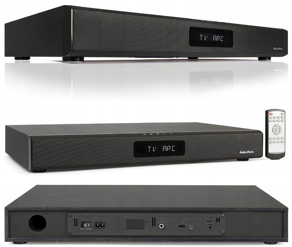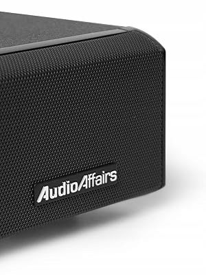 Czarny soundbar AudioAffairs TV to kompaktowe, wysokiej jakości, kompleksowe rozwiązanie kina domowego, zaprojektowane z myślą o znaczącej poprawie jakości dźwięku z telewizora.