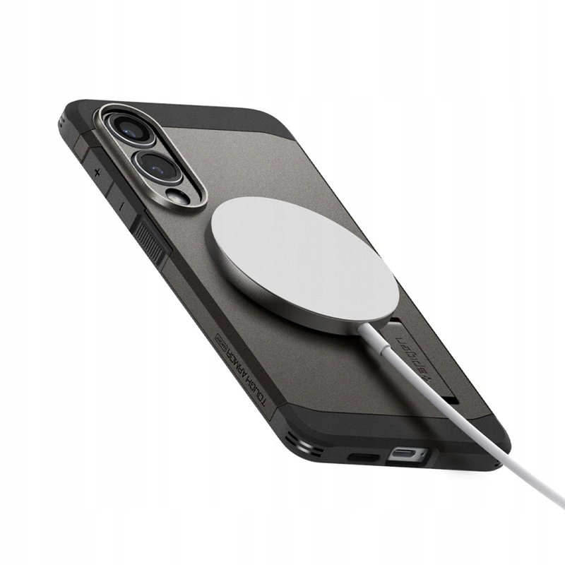 Spigen Tough Armor MagSafe to hybrydowe etui, które zostało wyposażone w magnetyczny pierścień kompatybilny z akcesoriami MagSafe®,