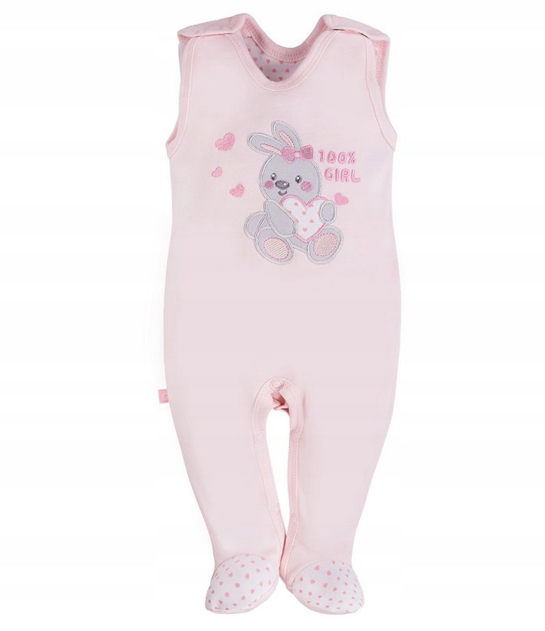 Śpioch uszyty z miękkiej i przyjemnej w dotyku melanżowej dzianiny bawełnianej. Z przodu znajduje się duży haft uroczego zwierzątka. Krój umożliwia całkowite rozpięcie na ramionkach oraz w kroczku, przez co ubranko jest funkcjonalne i wygodne. Wykończony jest miękką lamówką.