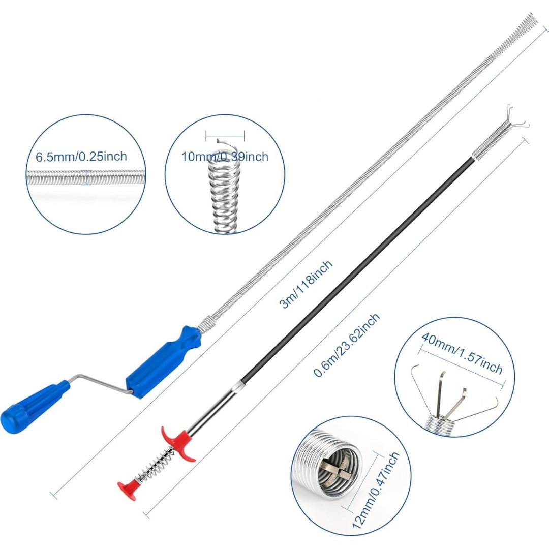 Zestaw do czyszczenia odpływów — 2 spiralne czyściki do rur o długości 3 m i 0,6 m, spiralny czyścik do rur kuchennych, spiralny haczyk do udrażniania przewodów, kompatybilny z końcówką wiertarską, tzw. „drain snake”.