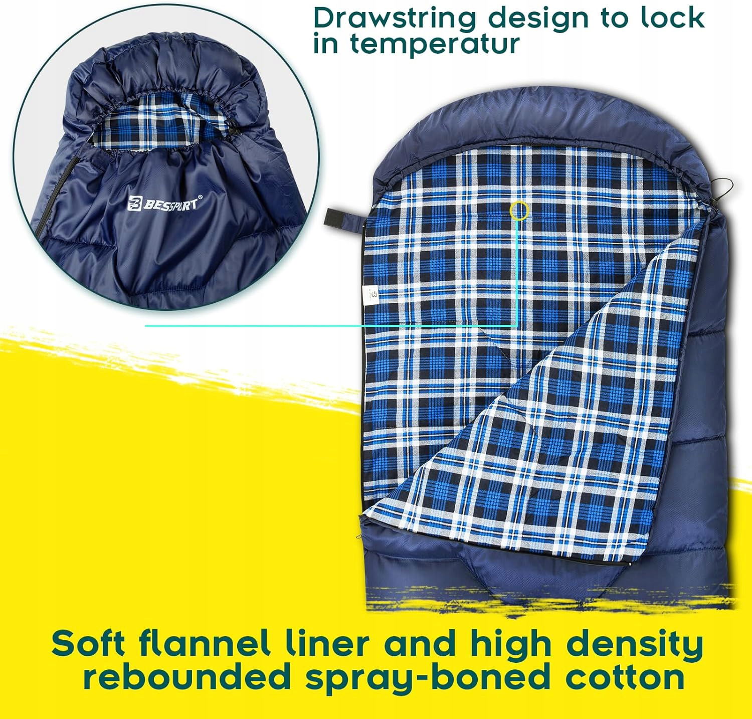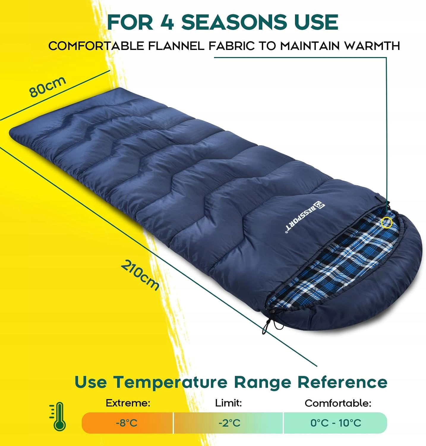 Luźny i przenośny Rozmiar flanelowego śpiwora wynosi 210 x 80 cm. Te śpiwory są niewiarygodnie przestronne dla każdego dorosłego o długości 195 cm lub mniejszej, idealne dla dużych mężczyzn i aktywnych śpiochów, śpiących na boku, którzy chętnie poruszają się śpiworem kompresyjnym o wadze zaledwie 2,4 kg jest bardzo kompaktowy i łatwy do przenoszenia.