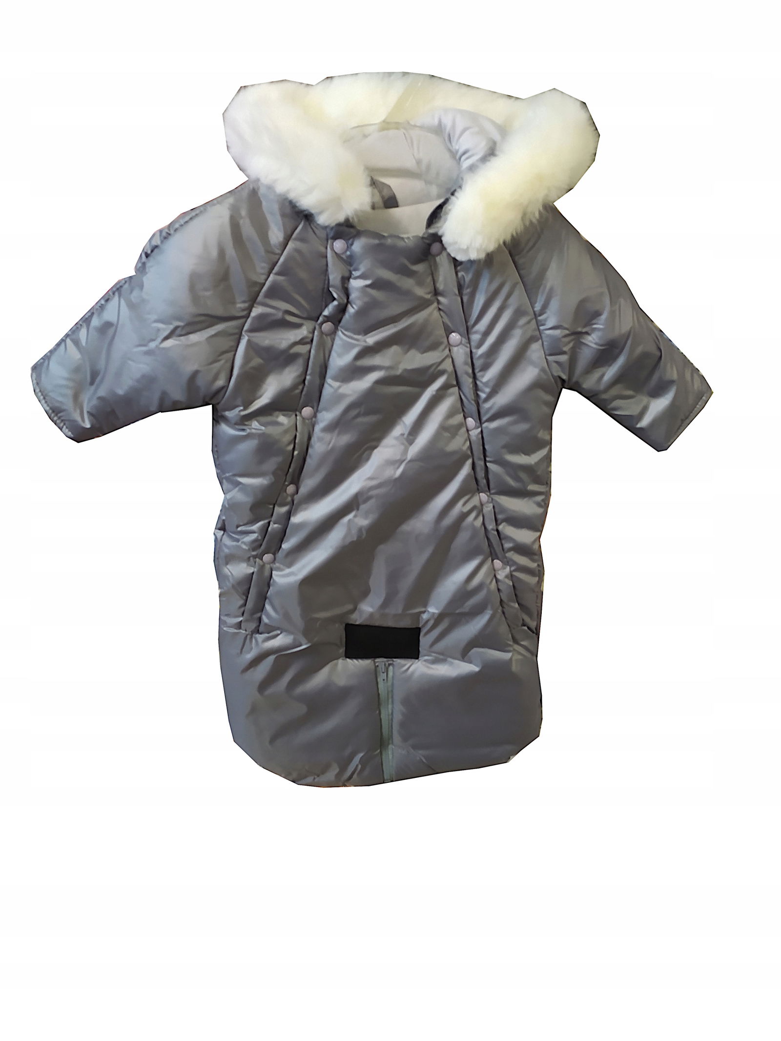 Śpiworek uszyty z miękkiej i przyjemnej w dotyku tkaniny. Z przodu znajduje się naszywka z ekoskórki. Przód zapinany na bezniklowe napki. Po bokach dwa zamki. Kaptur wykończony futerkiem. Śpiworek posiada wewnątrz ocieplinę i bawełnianą podszewkę.