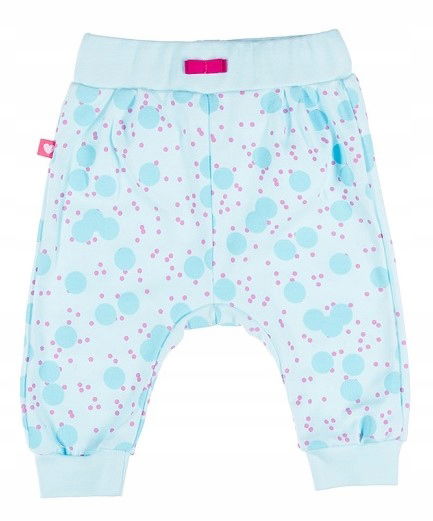 Uszyte z wysokogatunkowego, miękkiego i przyjemnego w dotyku materiału .W pasie ściągacz, który nie uciska brzuszka dziecka. Nogawki zakończone mięciutkimi ściągaczami. Ozdobna tasiemka w pasie.