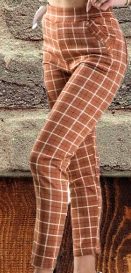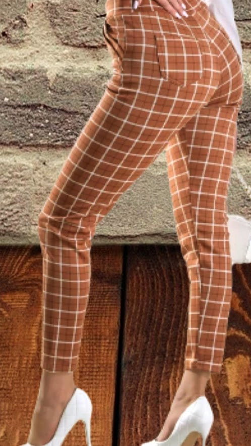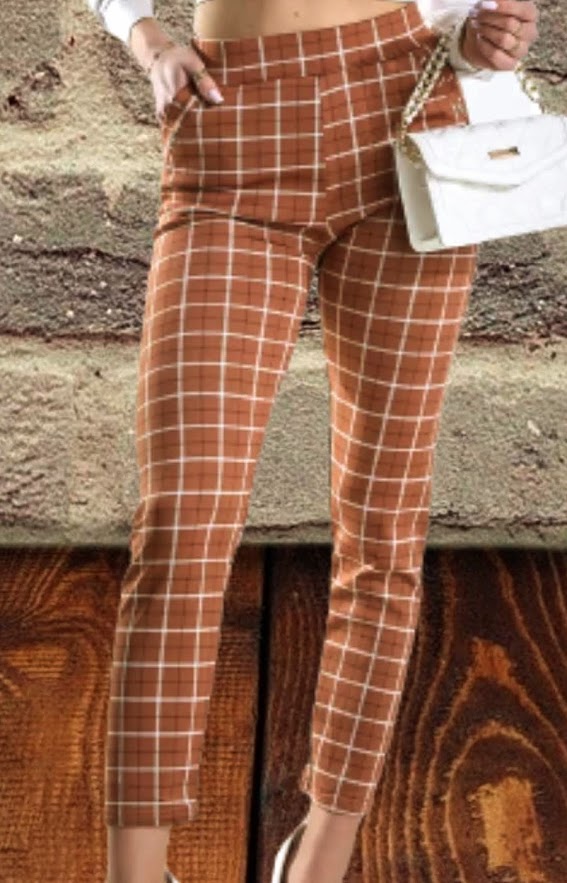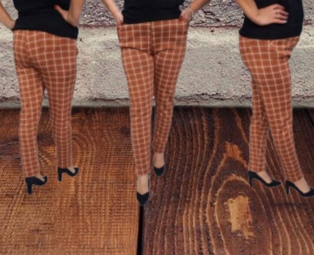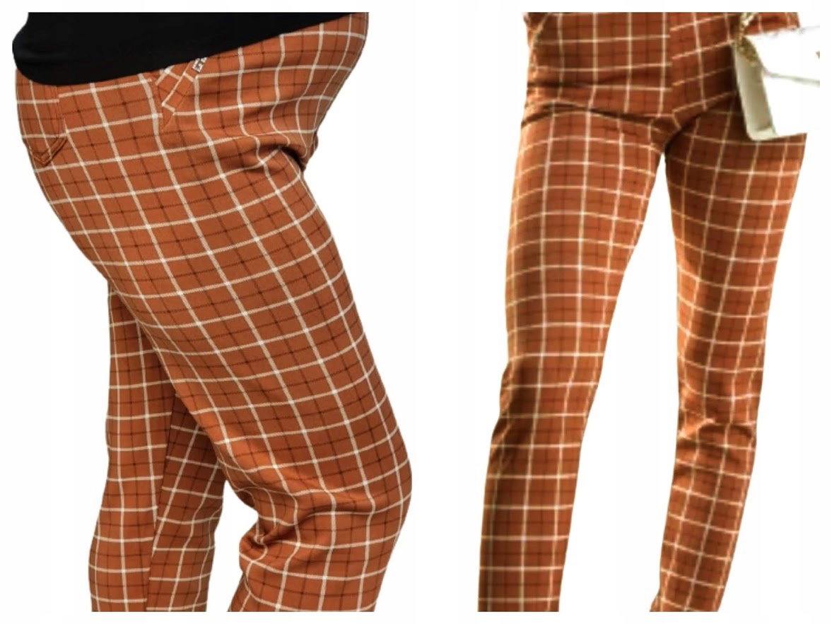 Spodnie damskie cygaretki w kratkę 7XL/8XL brązowe z kieszeniami