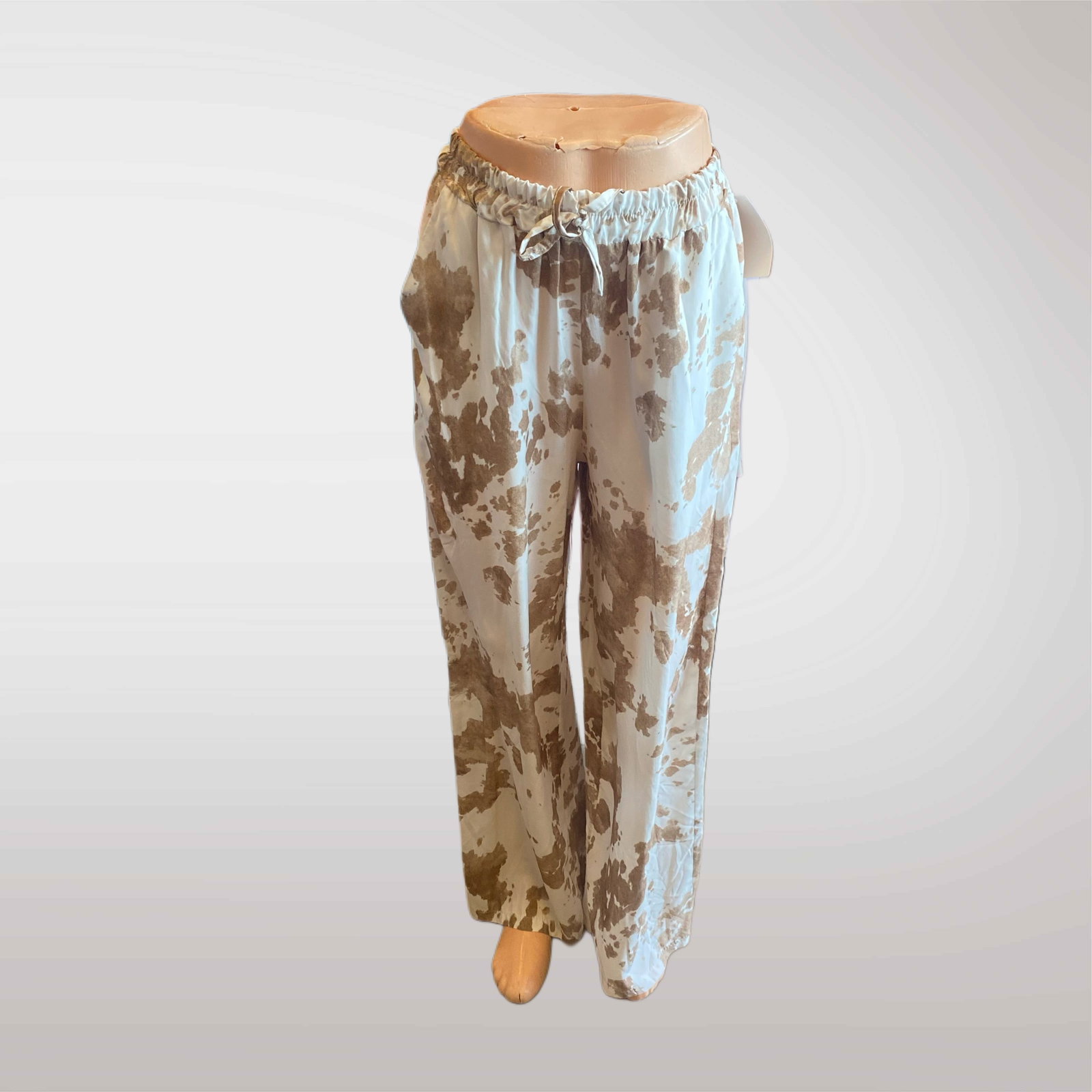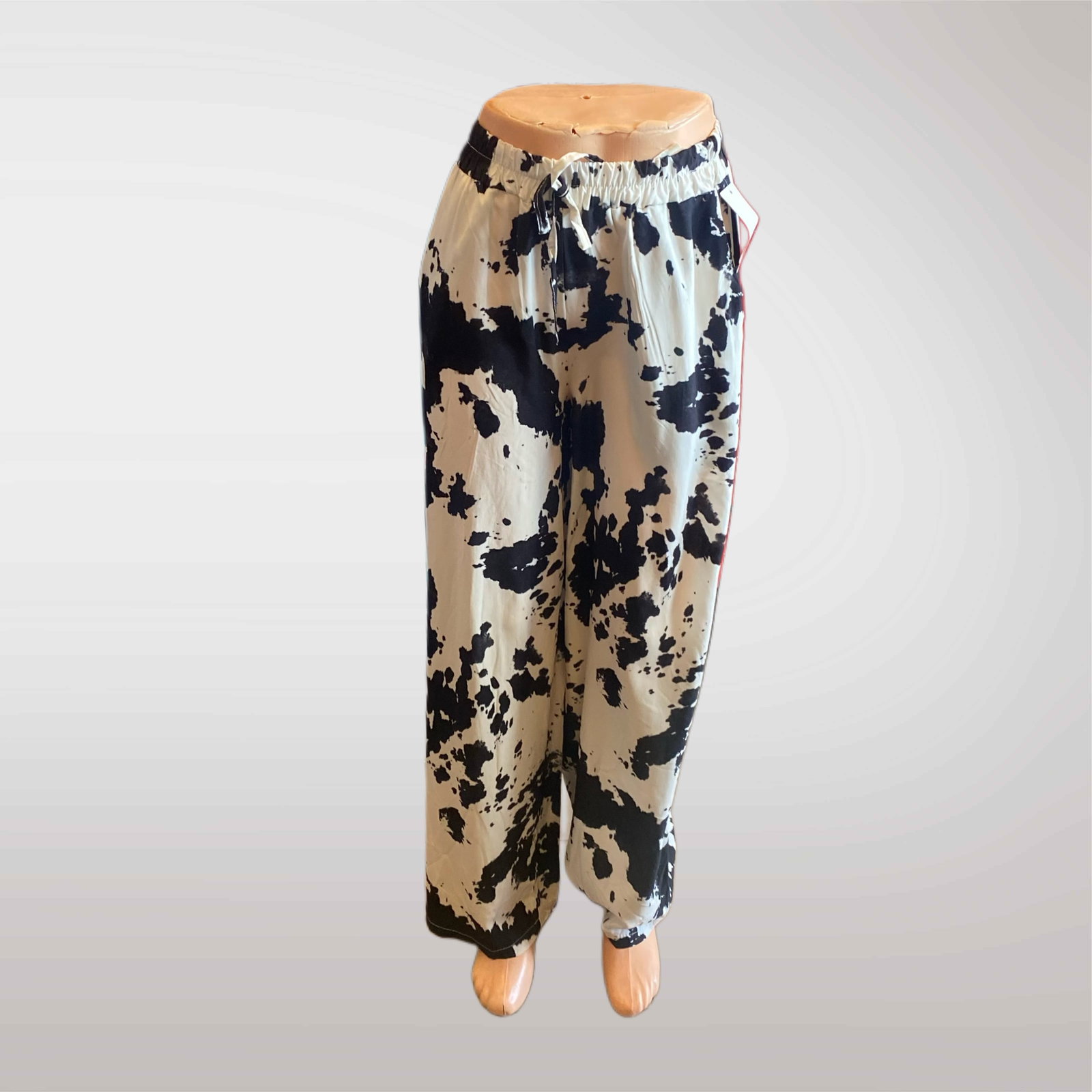 Spodnie damskie z prostą, luźną nogawką, wykonane z lekkiego i przewiewnego materiału. Posiadają elastyczną talię ze sznurkiem do regulacji, co zapewnia komfort noszenia. Modny wzór w krowie łaty dodaje charakteru i sprawia, że spodnie są hitem tej wiosny.