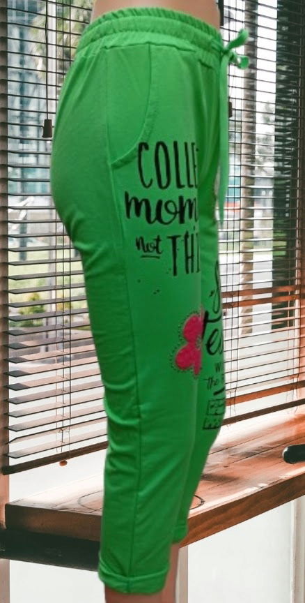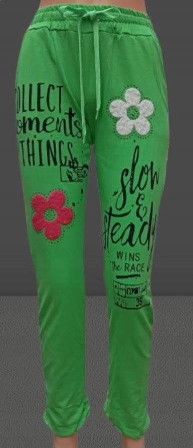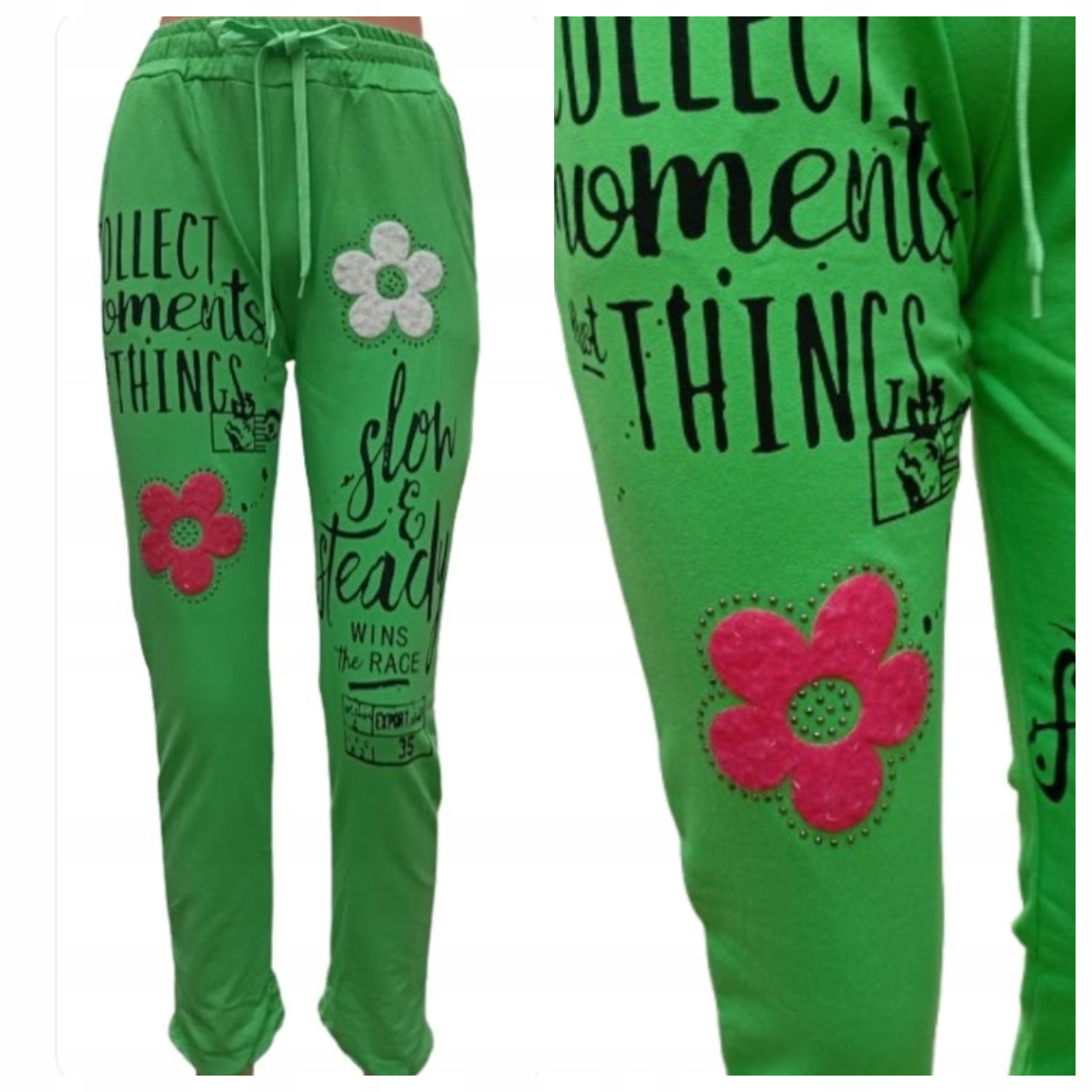 Spodnie DRESOWE damskie wiosenne w kwiaty elastyczne zielone bawełna