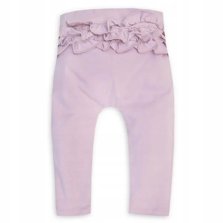 Uszyte z wysokogatunkowego, miękkiego i przyjemnego w dotyku materiału .W pasie ściągacz, który nie uciska brzuszka dziecka. Ozdobne falbanki z tyłu spodenek.