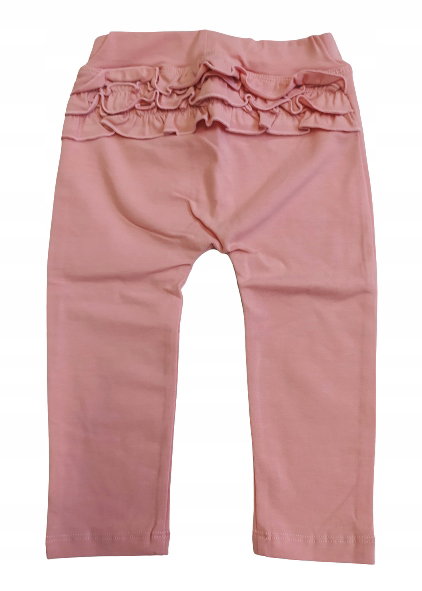 Uszyte z wysokogatunkowego, miękkiego i przyjemnego w dotyku materiału .W pasie ściągacz, który nie uciska brzuszka dziecka. Ozdobne falbanki z tyłu spodenek.