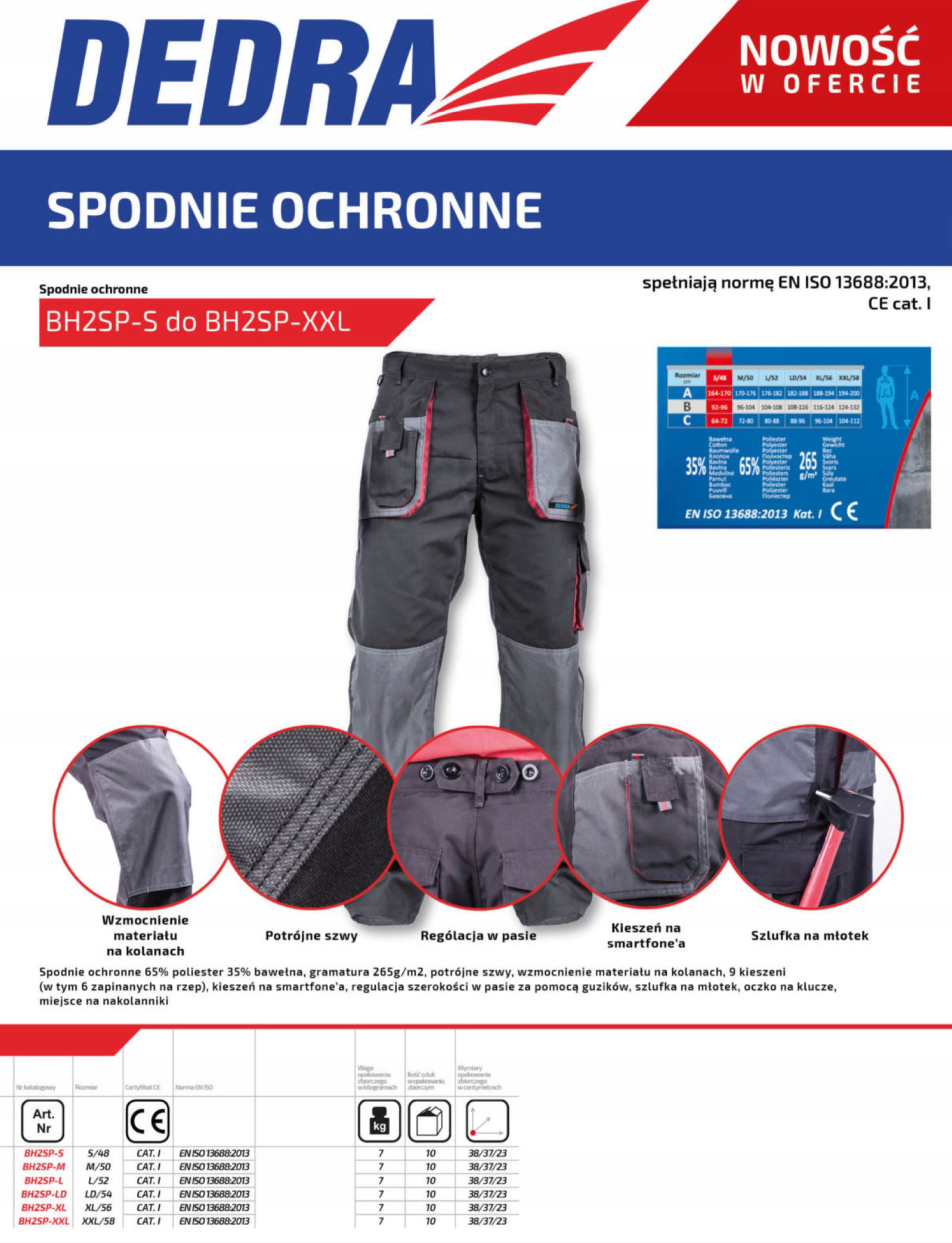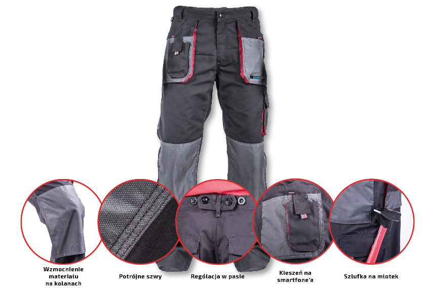 Spodnie ochronne z linii PERFECT LINE są wykonane z mieszanki poliestru i bawełny. Taki materiał o gramaturze 265 g/m² zapewnia dużą wytrzymałość na przetarcia i uszkodzenia mechaniczne. Dodatkowe wzmocnienia na kolanach. Posiada funkcjonalne kieszenie, w tym kieszeń na smartfona. Dla zwiększenia wytrzymałości spodni zastosowano potrójne szwy. Idealnie sprawdzą się podczas ciężkich prac budowlanych i remontowych.Cechy: