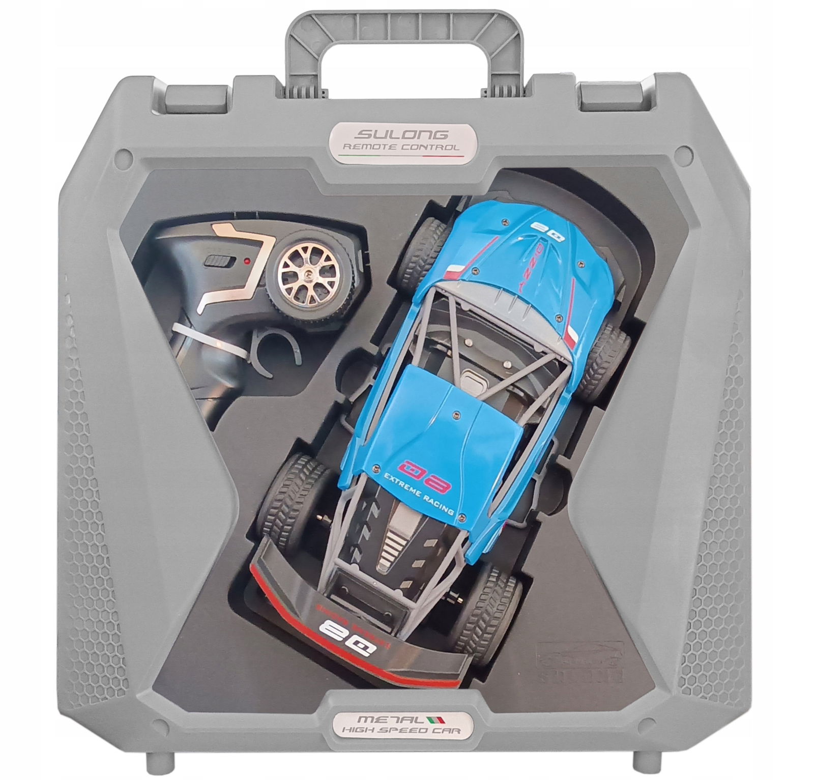Super mocny, szybki samochód w kolorze niebieskim na pewno przypadnie do gustu każdemu kto lubi wyścigi samochodowe. Autko jest zdalnie sterowane za pomocą pilota.