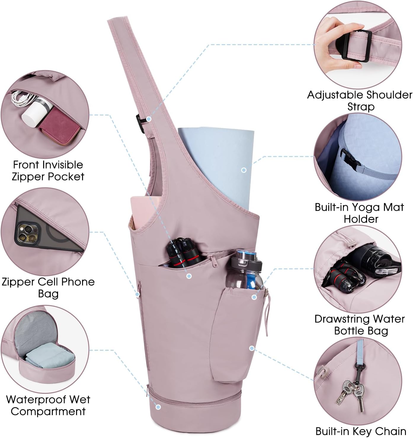 ⭐【Elegancka kieszeń na mokre rzeczy】1 wodoodporna kieszeń na mokre rzeczy zapinana na zamek u dołu, o wysokości 7,8 cm i średnicy 21,7 cm. Pomieści ręczniki sportowe, spodnie do jogi lub inne przedmioty osobiste itp.
