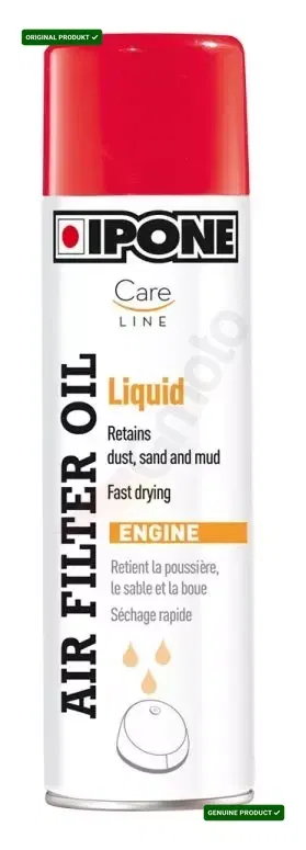 IPONE Air Filter Oil Liquid to specjalistyczny olej przeznaczony do nasączania piankowych filtrów powietrza w motocyklach. Jego formuła skutecznie zatrzymuje kurz, piasek i inne zanieczyszczenia, zapewniając optymalną ochronę silnika. Produkt poprawia wydajność filtracji, jednocześnie minimalizując opory przepływu powietrza.