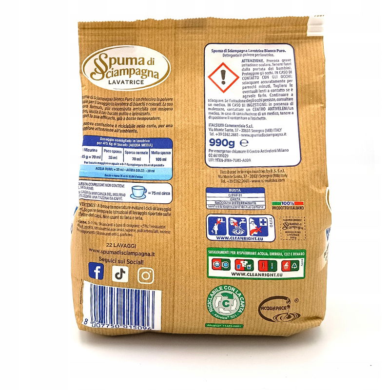Poznaj Spuma di Sciampagna Proszek do prania Bianco Puro, wyjątkowe rozwiązanie dla miłośników nieskazitelnej czystości i świeżych zapachów. Ten proszek do prania o wadze 990 g zapewnia wysoką wydajność, skutecznie usuwając zabrudzenia i plamy, jednocześnie chroniąc żywe kolory i miękkość tkanin. Przeznaczony do prania zarówno białych, jak i kolorowych ubrań, gwarantuje kompletne doświadczenie czystości, pozostając łagodnym dla tkanin.