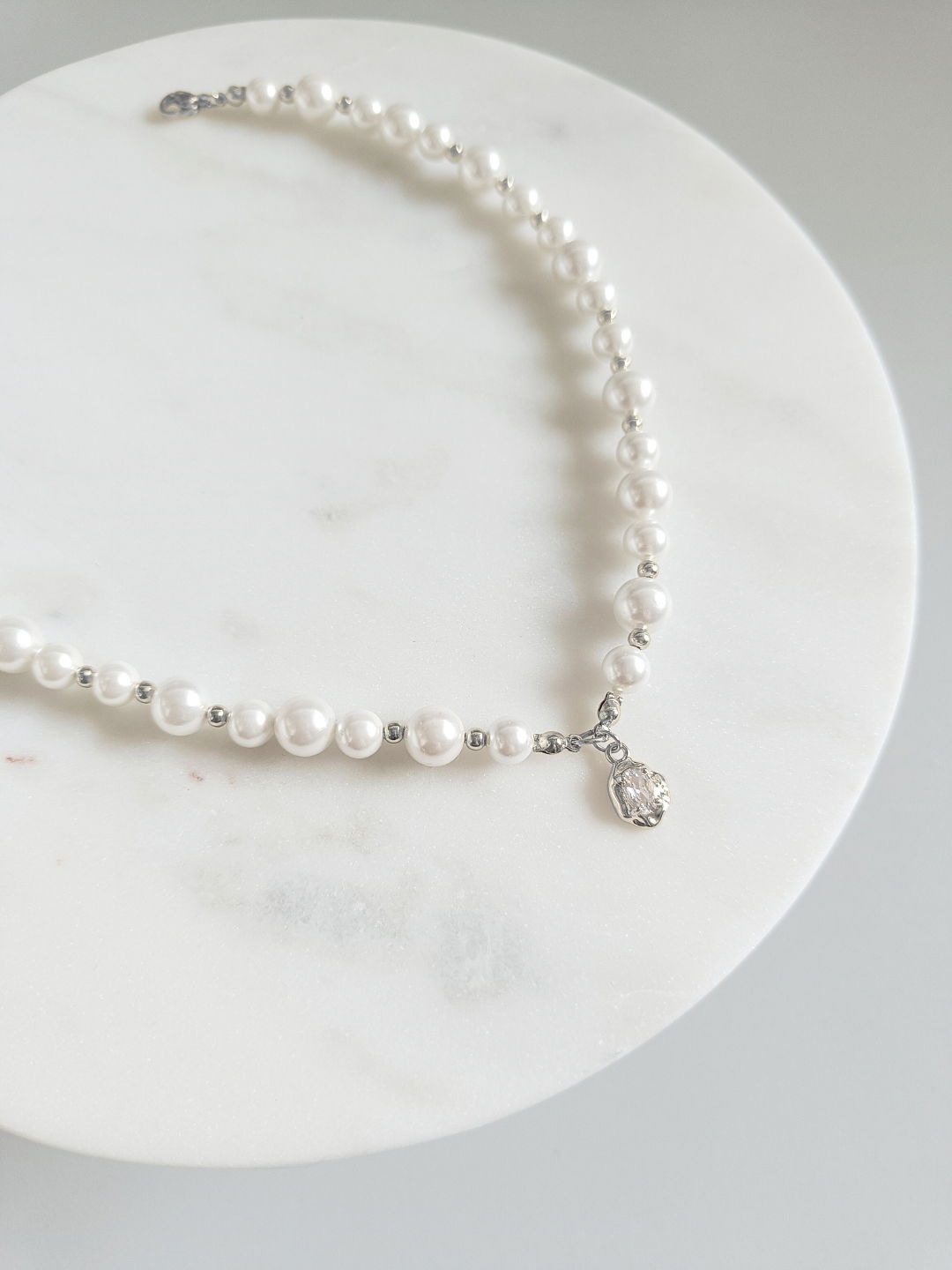 Naszyjnik wykonany ręcznie z mosiądzu platerowanego rodem, stali nierdzewnej i pereł muszlowych seashell.