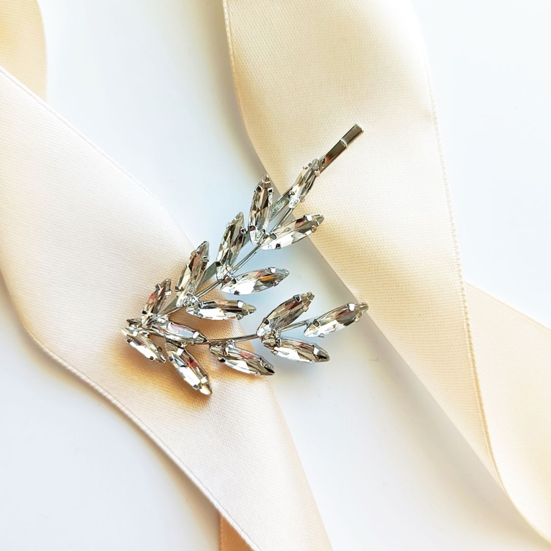 Szukasz srebrnej wsuwki ozdobionej błyszczącymi listkami? Właśnie na nią patrzysz. Ta ozdoba idealnie dopełni każde upięcie typu french twist, fale hollywod czy subtelne półupięcie. Wystarczy ją wsunąć we włosy.