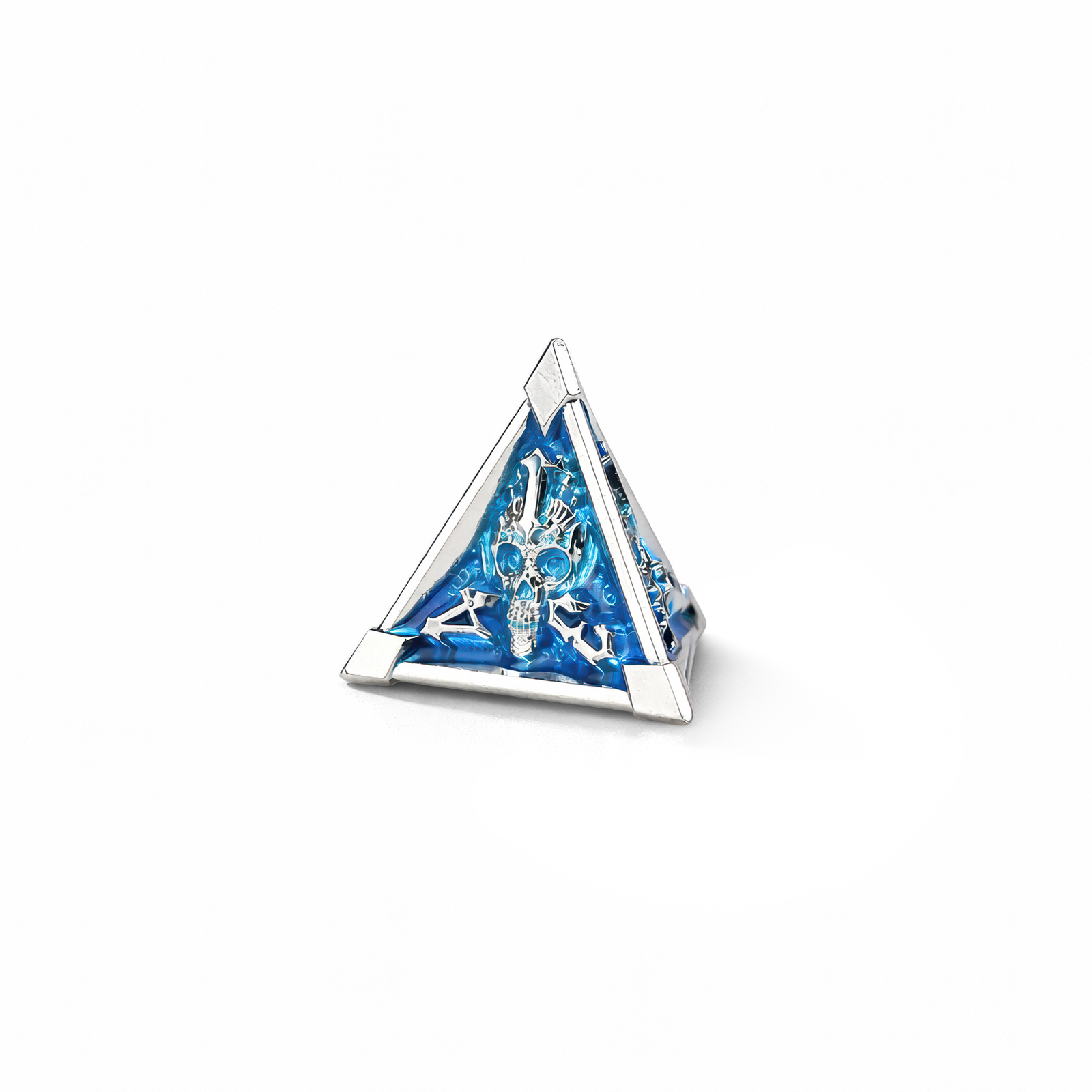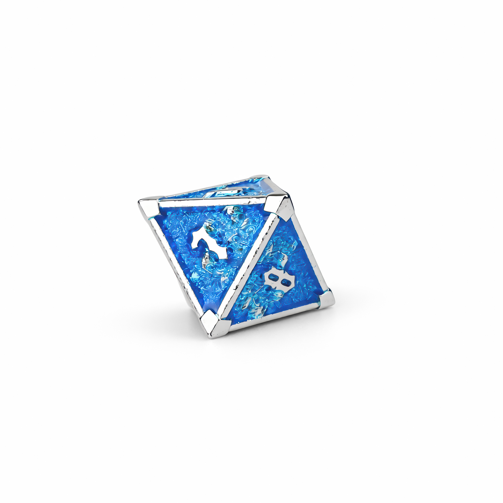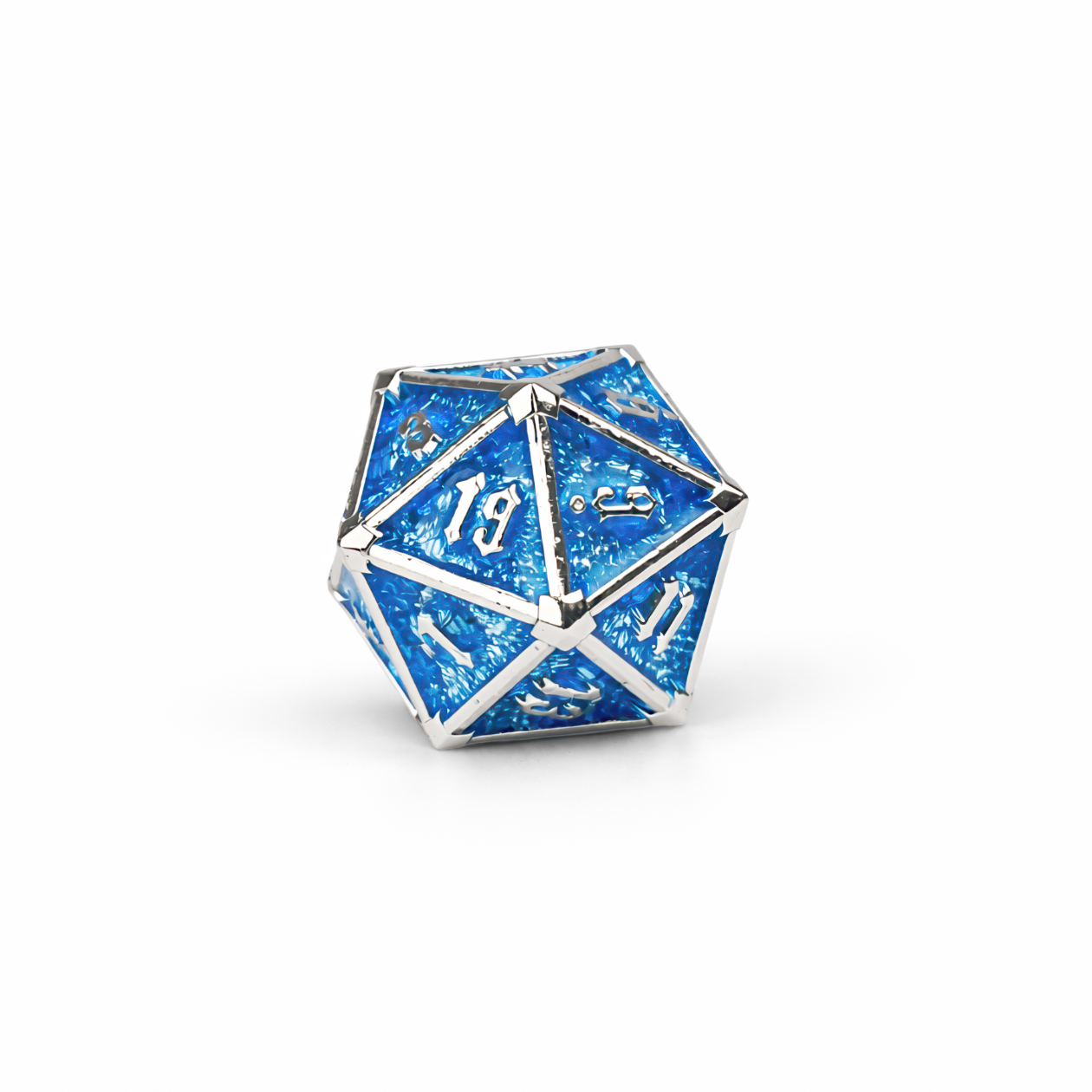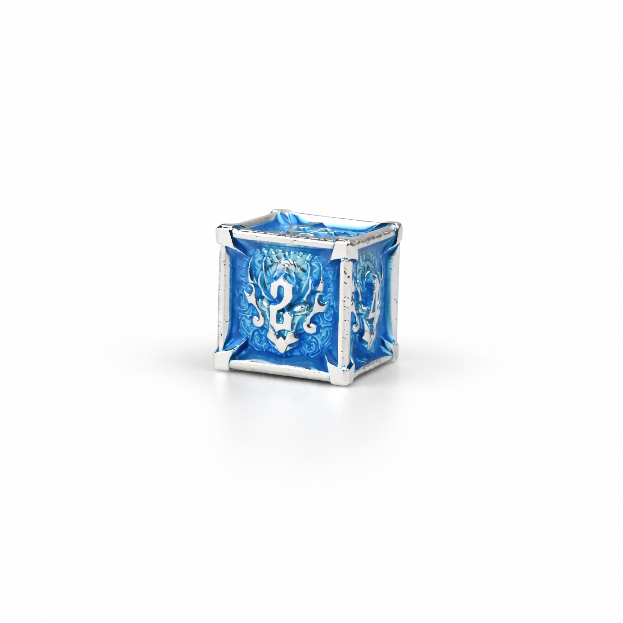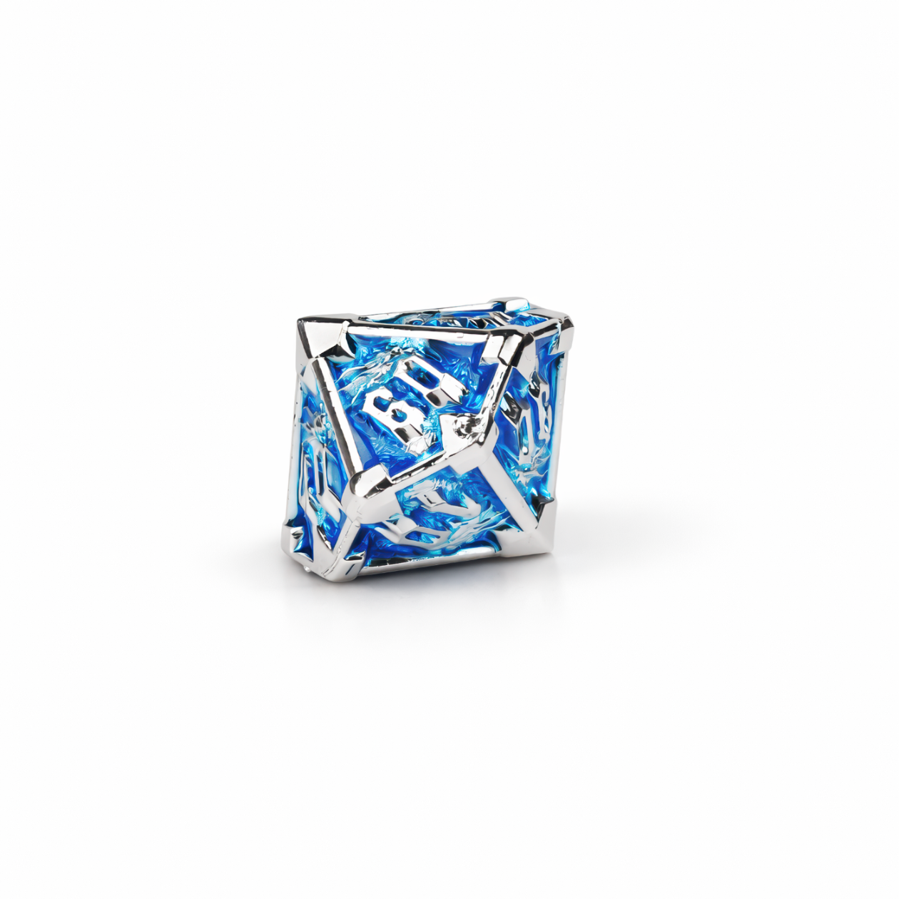 W ciszy tuż przed wypowiedzeniem zakazanego zaklęcia ten Set wygląda jak relikt wykradziony z magicznego skarbca — stworzony po to, żeby każdy rzut brzmiał jak rytuał. Przy wyrazistych 3 cm te metalowe kości robią wrażenie: lustrzanie srebrna rama i głęboko przezroczyste, niebieskie ścianki wyglądają jak wirujący „mroźny ogień” uwięziony pod błyszczącą taflą. Detale są ostre i czytelne — gotyckie cyfry odcinają się mocno (widać wyraźne 19 na k20 i 12 na k12), a k4 ma mocny motyw rogatej czaszki z kanciastymi znakami dookoła, jak ostrzeżenie wyryte w kamieniu ołtarza. Ta „klatkowa” krawędź to nie tylko efekt wow — nadaje każdej kości rzeźbiarską, opancerzoną sylwetkę, z fazowanymi listwami i narożnymi zakończeniami, które łapią światło jak wypolerowane talizmany. Metalowa konstrukcja daje przyjemny ciężar w dłoni i premium połysk na biurku, kojarzący się z runicznymi artefaktami i przeklętymi relikwiami z klasycznej mrocznej fantasy. Weź zestaw na kolejną sesję, trzymaj obok karty postaci „na szczęście” albo ustaw na półce jako niebiesko-srebrny akcent — w każdym wariancie Set aż prosi się, żeby dołączyć do Twojej kolekcji i kusić los jednym rzutem.