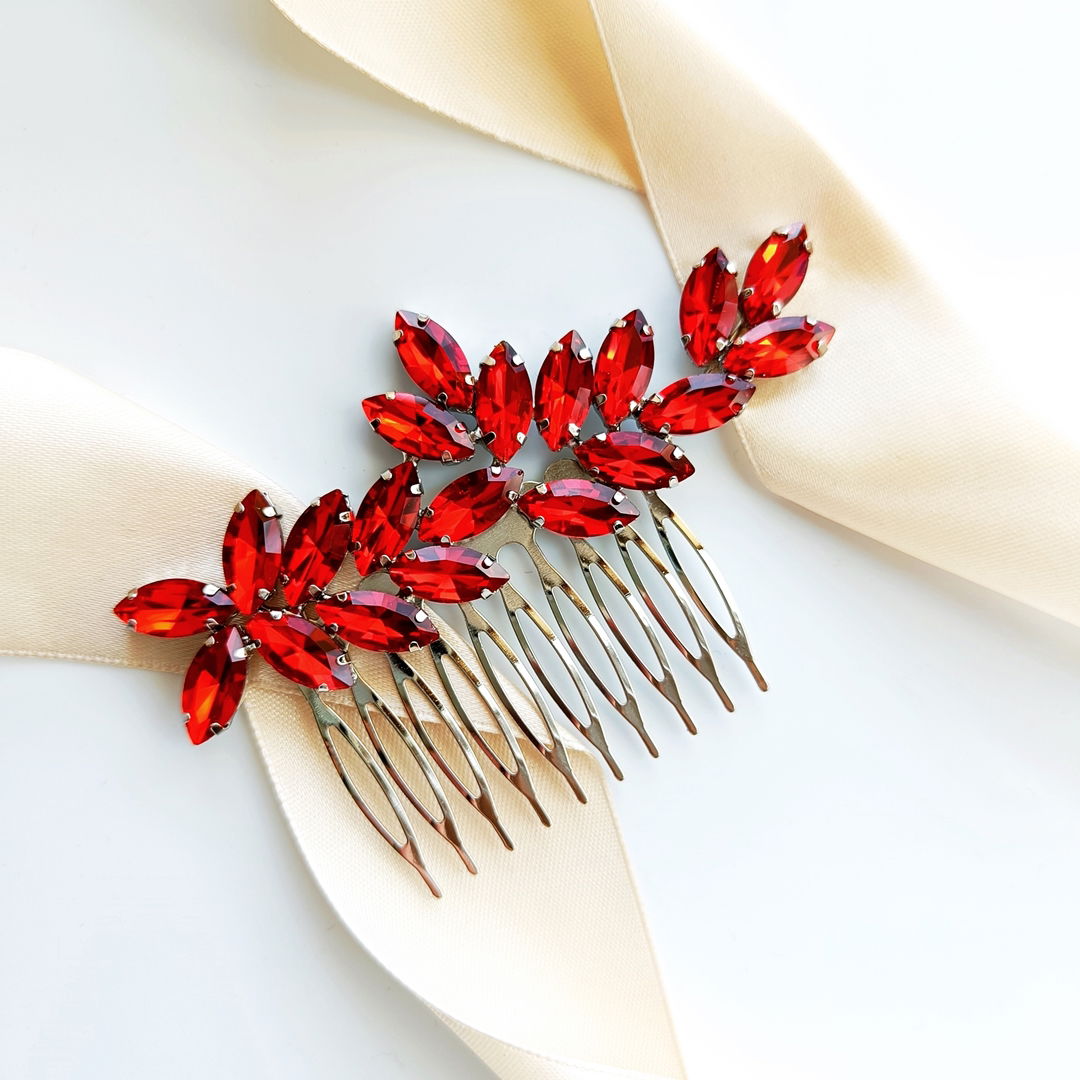 Ozdobny srebrny grzebień z motywem czerwonych cyrkoniowych listków dzięki swojej uniwersalności będzie odpowiedni do wielu wieczorowych stylizacji. Ozdoba jest dość sztywna, dlatego nie martw się, że zmieni swój kształt podczas szalonej zabawy na parkiecie. (Na zdjęciu złota wstążka odbija się od lustrzanej powierzchni grzebyka, stąd wydaje się, że jest złoty - baza ozdoby jest koloru srebrnego).