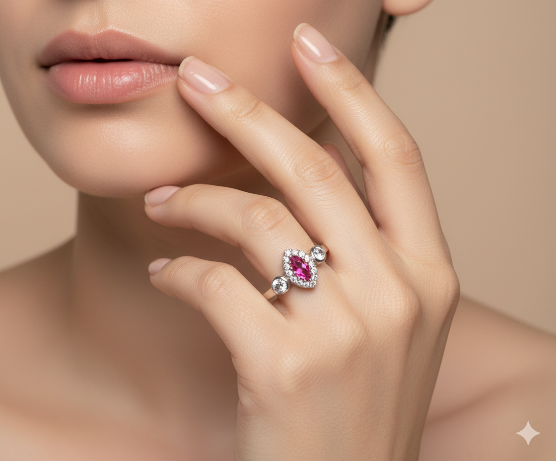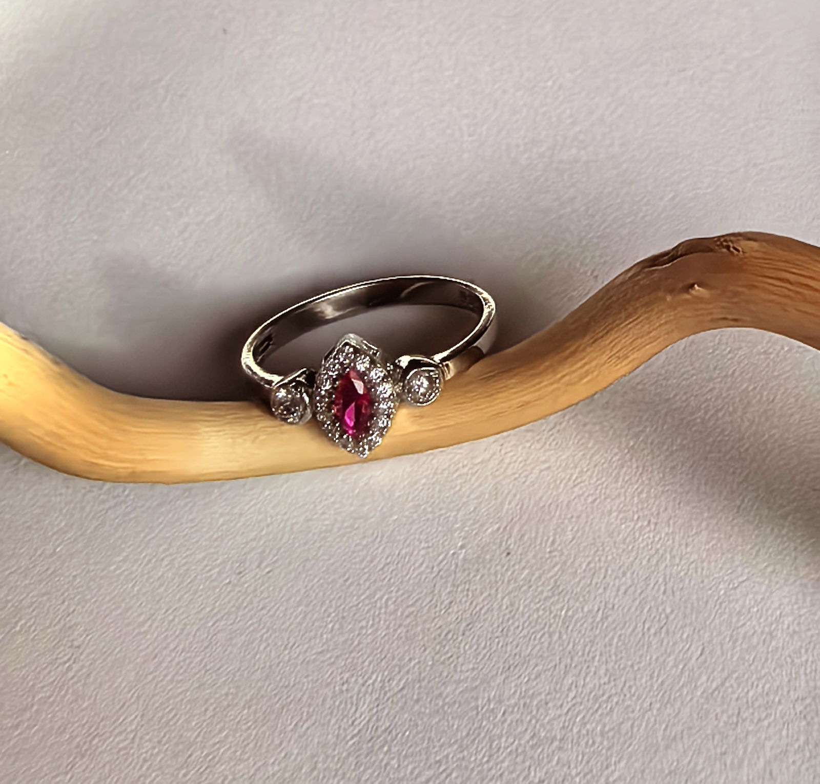 centralna czerwona cyrkonia w kształcie markizy otoczona jest delikatnym halo z cyrkonii, a po bokach zdobią ją dodatkowe dwie większe cyrkonie, tworząc harmonijną kompozycję pełną blasku