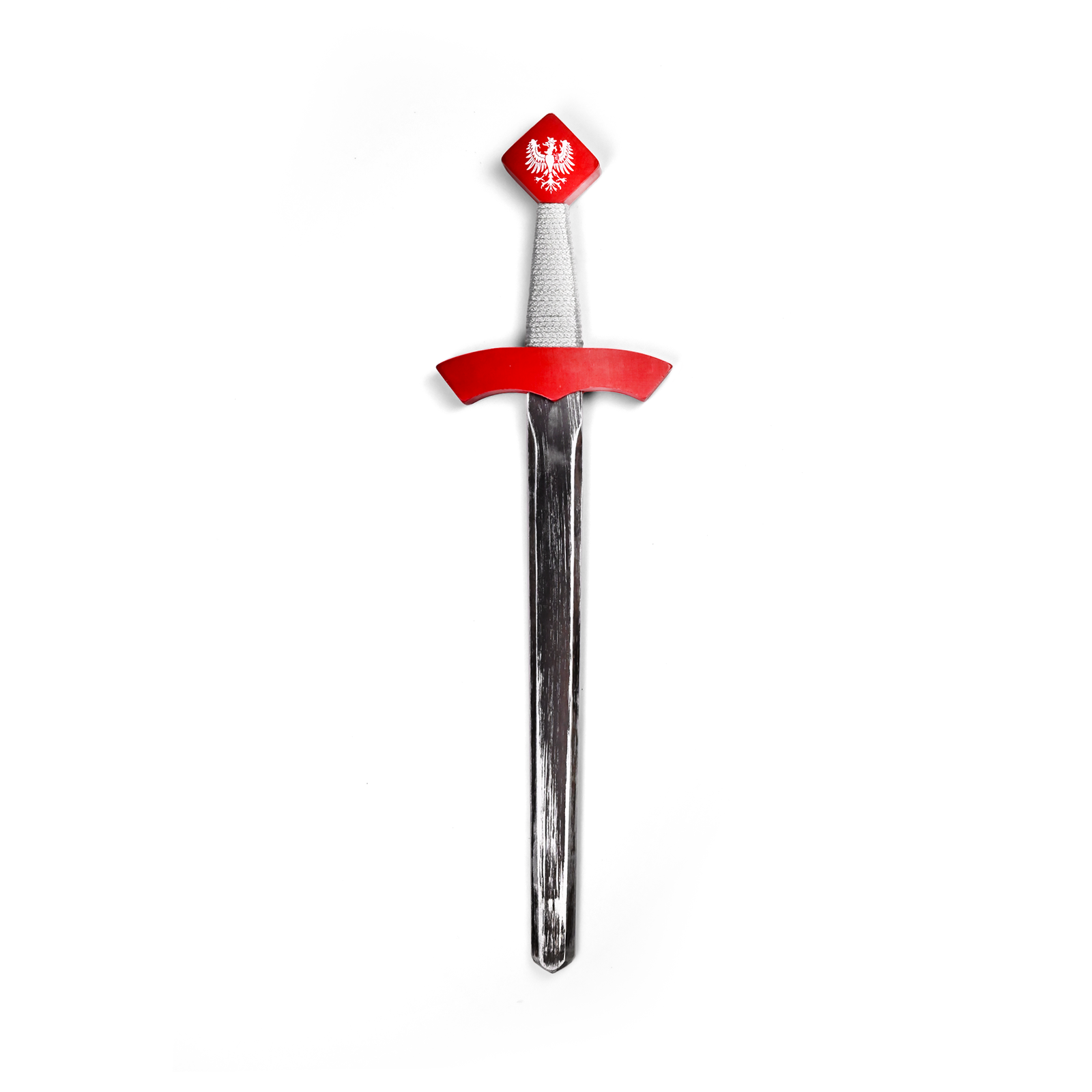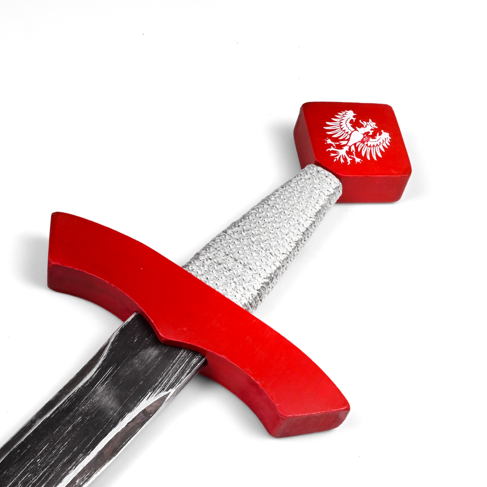 Wejdź do świata średniowiecznych legend z tym Mieczem Średnim (45 cm, Drewno), pięknie wykonanym kolekcjonerskim przedmiotem inspirowanym historycznym rzemiosłem. Czerwony jelec i głowica ozdobiona białym orłem nadają mu wyjątkowy charakter, doskonale pasujący do młodych rycerzy oraz miłośników epoki. Połączenie autentycznego wyglądu z funkcjonalnością sprawia, że polerowane drewniane ostrze prezentuje się efektownie, a jednocześnie pozostaje lekkie i bezpieczne w użyciu. Srebrzysta, fakturowana rękojeść zapewnia pewny chwyt, co czyni miecz doskonałym wyborem do zabawy, strojów historycznych i dekoracji. Wyrazista kombinacja czerwieni i srebra podkreśla jego rycerski charakter, nawiązując do dawnych wzorców rzemiosła. Ten Miecz Średni to nie tylko zabawka, lecz także hołd dla średniowiecznej heraldyki, a biały orzeł na głowicy symbolizuje siłę i tradycję. Świetnie sprawdzi się w rekonstrukcjach historycznych, zabawach kostiumowych i jako unikalny element kolekcji. Niezbędny kolekcjonerski przedmiot średniowieczny oraz efektowny dodatek do średniowiecznych akcesoriów.