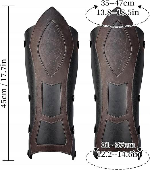 Model ten charakteryzuje się uniwersalnym rozmiarem dzięki zastosowaniu systemu sznurowania oraz regulowanych pasków, co pozwala na idealne dopasowanie do każdej łydki. ? ✅ Materiał jest miękki, ale wytrzymały, co gwarantuje komfort noszenia nawet podczas wielogodzinnych wypraw w trudnym terenie. Vintage'owe wykończenie i metalowe sprzączki nadają ochraniaczom surowy, wojowniczy charakter, który przyciągnie wzrok na każdym konwencie czy festiwalu historycznym! ? ?