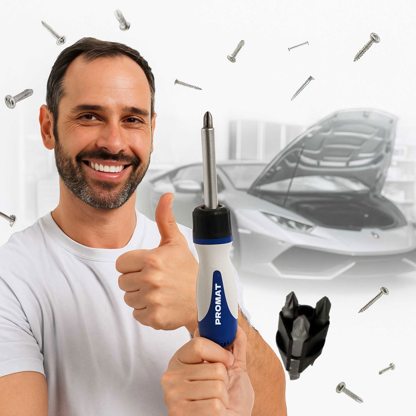 ? Wbudowany magazynek – jak rewolwer, tylko do roboty! Zawsze pod ręką, nic nie gubisz. ? Grzechotka lewo/prawo – klik, klik, gotowe. Nie musisz kręcić jak młynkiem! ? Poręczna rękojeść – ergonomiczna, gumowana, pewny chwyt – nawet w rękawiczkach. ? Standardowe mocowanie 1/4” – działa z większością bitów na rynku. ? Zestaw najpotrzebniejszych bitów – PH, PZ, SL – na start masz wszystko.