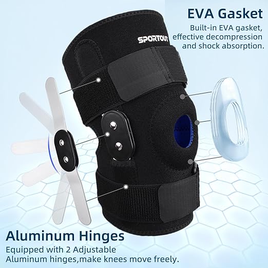Otwarta konstrukcja rzepki z poduszką: otwarta konstrukcja rzepki ortezy kolanowej Sportout redukuje nacisk na rzepkę i zapewnia, że rzepka pozostaje połączona z resztą stawu.