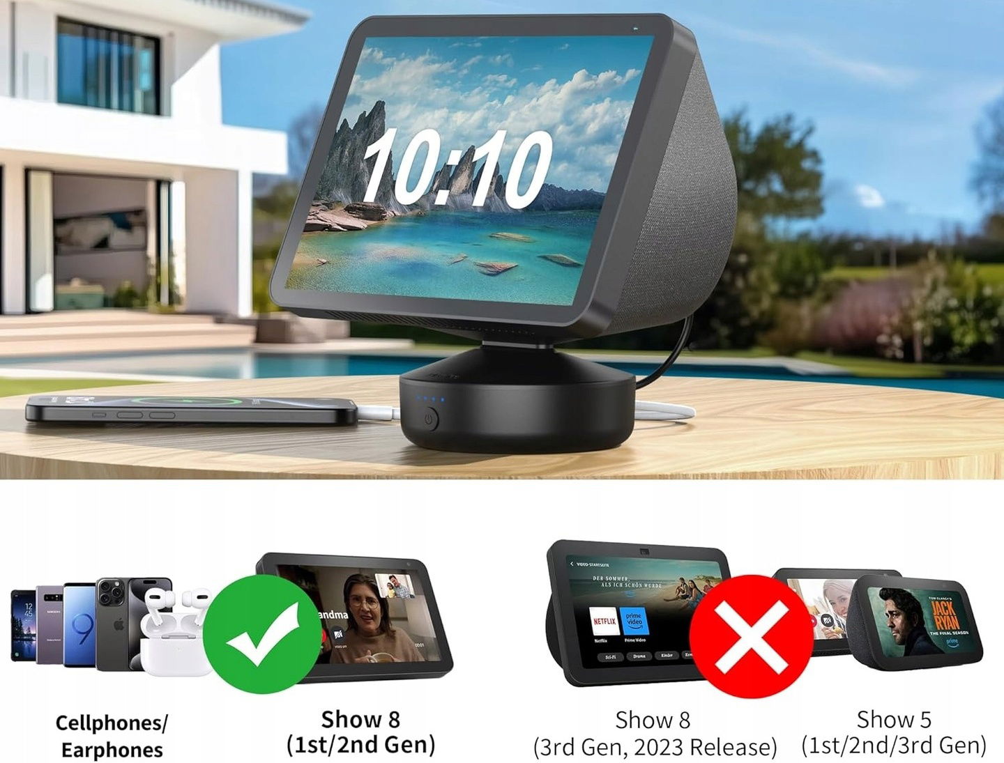 ✅ Kompatybilność: Wyłącznie dla Echo Show 8 (1./2. gen.). Nie pasuje do Show 8 (3. gen.) i Show 5. Urządzenie i ładowarka nie są dołączone.
