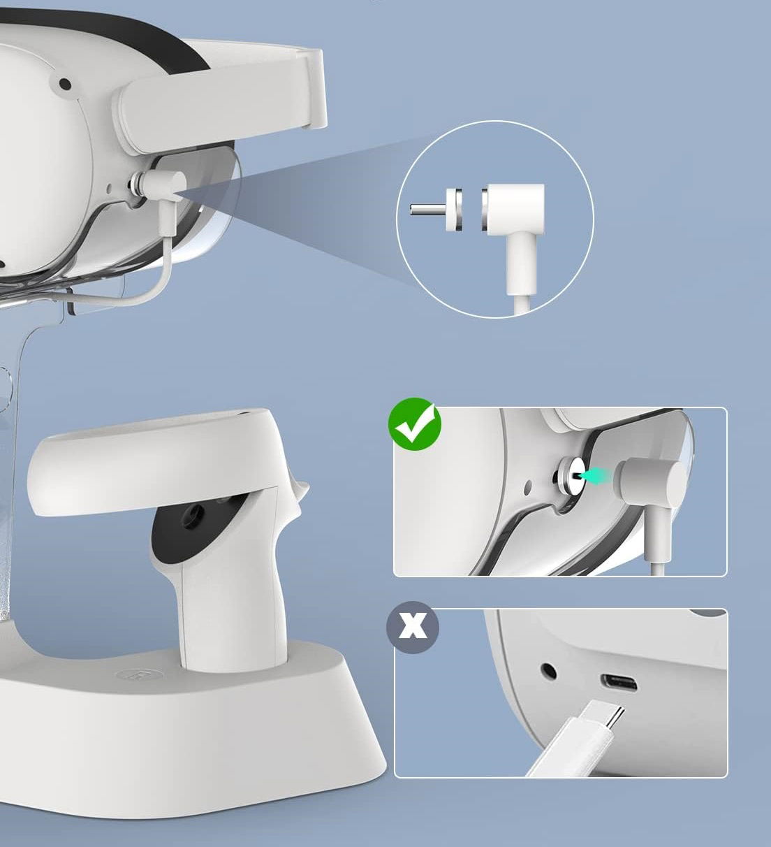 - Magnetyczne Złącze USB-C: Dołączone magnetyczne złącze USB-C pozostaje w porcie USB-C Twojego zestawu Quest 2, zapewniając automatyczne, stabilne połączenie magnetyczne za każdym razem.