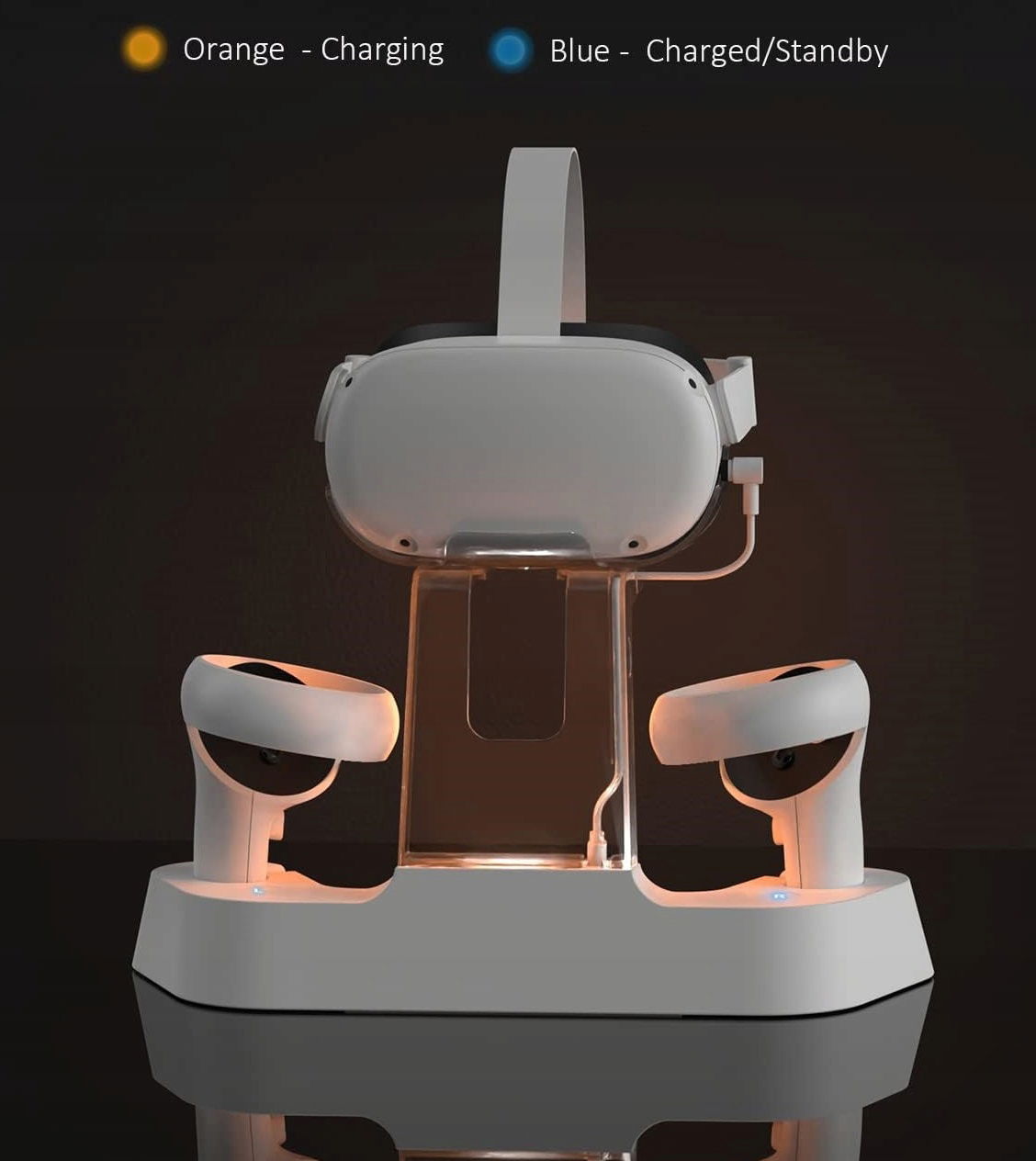 - Stylowy Stojak / Display: Stacja służy również jako elegancki stojak, pomagający utrzymać porządek w strefie gamingowej. Stylowy design i kolorowe światła LED dodają estetyki do wyposażenia VR.