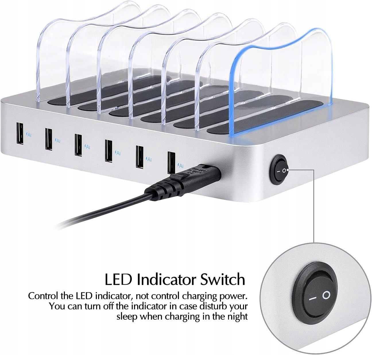 INTELIGENTNY RDZEŃ IC I 6 PORTÓW USB - Stacja ładująca USB może ładować wszystkie urządzenia USB. Wbudowany inteligentny chip może automatycznie wykryć i dostarczyć wymagany prąd ładowania (0-2,4A) dla różnych urządzeń, takich jak smartfony, tablety, power banki, e-czytniki, głośniki Bluetooth, zestawy słuchawkowe, MP3, MP4 i inne.