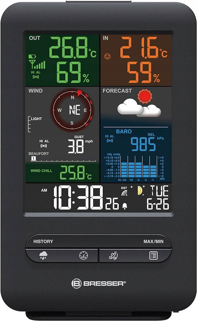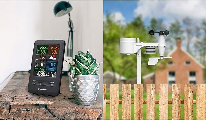Dzięki BRESSER Weather Center 5 w 1 Beaufort zawsze masz pogodę na ekranie - wyraźnie i kolorowo. Stacja pogodowa oferuje również duży wyświetlacz o sprytnym układzie - umożliwiający szybkie sprawdzenie pogody jednym rzutem oka. Dzięki eleganckiemu wzornictwu urządzenie idealnie wpasuje się w każde otoczenie mieszkalne – czy to w wiejskim stylu, czy w stylu minimalistycznym. Wartości zmierzone przez czujnik zewnętrzny 5 w 1 dotyczące temperatury i wilgotności zewnętrznej są uzupełniane przez zintegrowany czujnik termiczny/higrosensor z dokładnymi danymi dotyczącymi temperatury, wilgotności i ciśnienia powietrza w pomieszczeniu . Abyś zawsze wiedział, skąd wieje wiatr – nawet jeśli chodzi o opady – stacja pogodowa może zdobywać punkty za pomocą anemometru i deszczomierza .