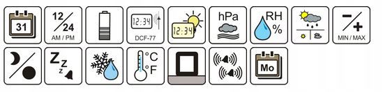 - Zegar sterowany radiowo, wyświetlacz daty i wyświetlacz dnia tygodnia lub wyświetlacz ciśnienia powietrza, stacja ta oferuje również: wyświetlanie trendów pogodowych (na okres 60 minut), wyświetlanie faz księżyca, 2 alarmy alarmowe z funkcją drzemki, przycisk dotykowy czujnika, a także możliwość odbioru do 3 czujników zewnętrznych.