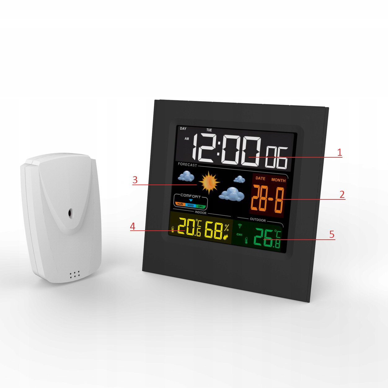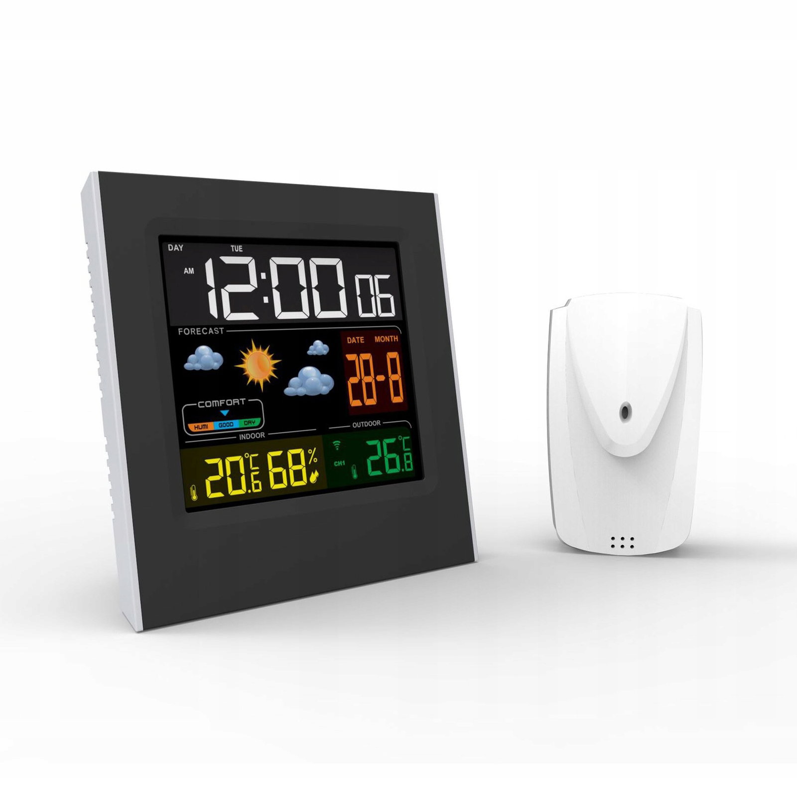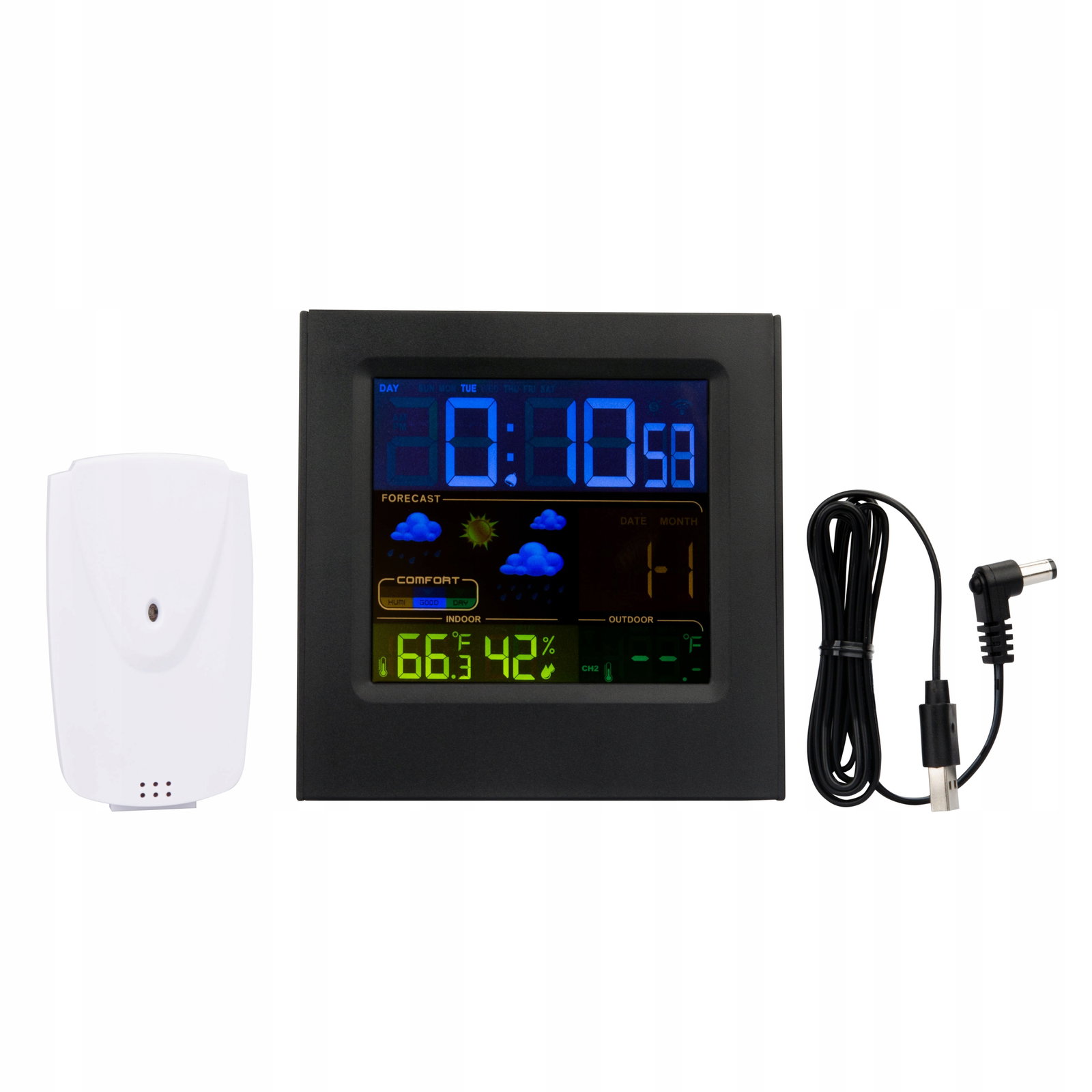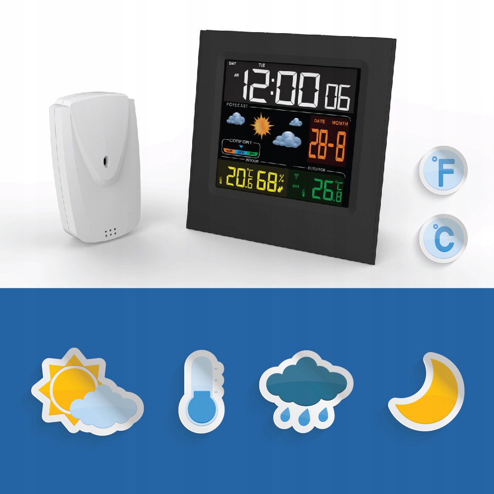 Urządzenie jest przydatne w każdym domu i może być wykorzystane na wiele sposobów. Produkt pełni rolę zegara, budzika oraz datownika. Sprawdzi się jako kalendarz, zegarek i budzik na stoliczku nocnym obok łóżka. Oprócz tego urządzenia wyświetla również prognozowaną pogodę oraz poziom komfortu wilgotności powietrza.