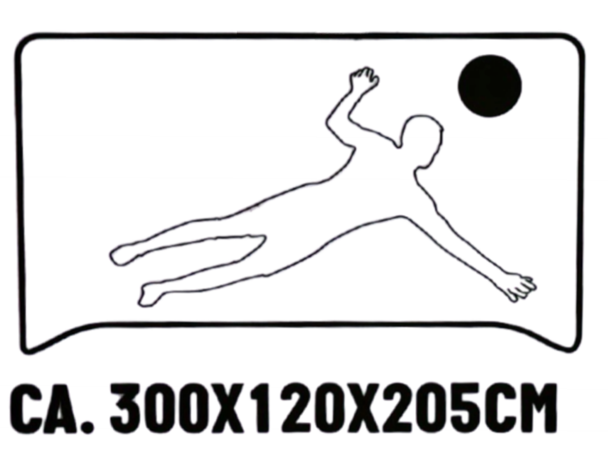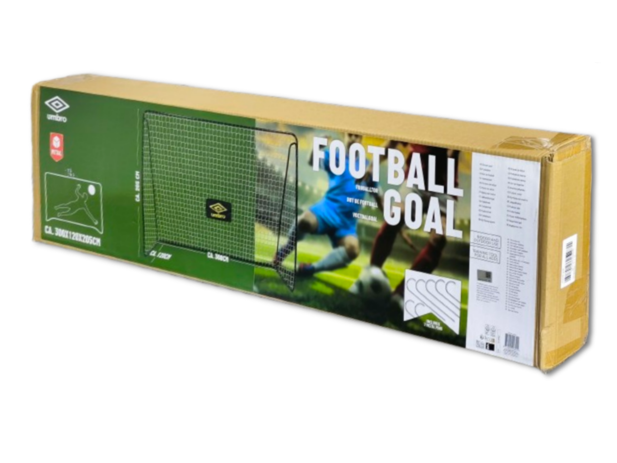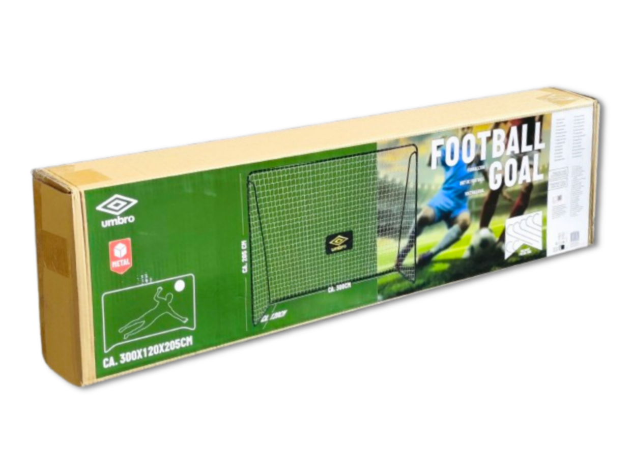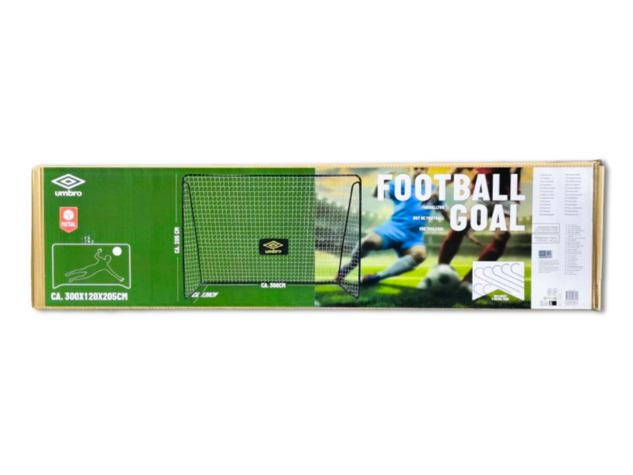 Bramka piłkarska XXL marki Umbro o szerokości 300cm i wysokości 205cm przeznaczona do gry w piłkę nożną. Bramka wykonana jest ze stalowych rurek o średnicy 32mm. Każda rurka jest ponumerowana a dzięki zatrzaskom można ją w szybki i łatwy sposób złożyć jak tez w razie potrzeby rozłożyć. Zestaw zawiera bramkę, nylonową siatkę i śledzie umożliwiające przymocowanie bramki do podłoża.