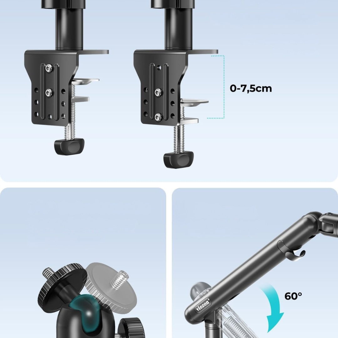 - Możliwość regulacji szerokości: stojak jest regulowany pod wieloma kątami. Składa się z 3 ramion przegubowych. Pierwsze dwa ramiona przegubowe można obracać w poziomie o 180° lub 360°, co ułatwia nagrywanie większego pola widzenia. Dolny zacisk stołowy ma regulowany zakres zacisku do 7,5 cm, który można dopasować do stołów lub stołów roboczych o różnej grubości i zapewnia stabilne trzymanie.