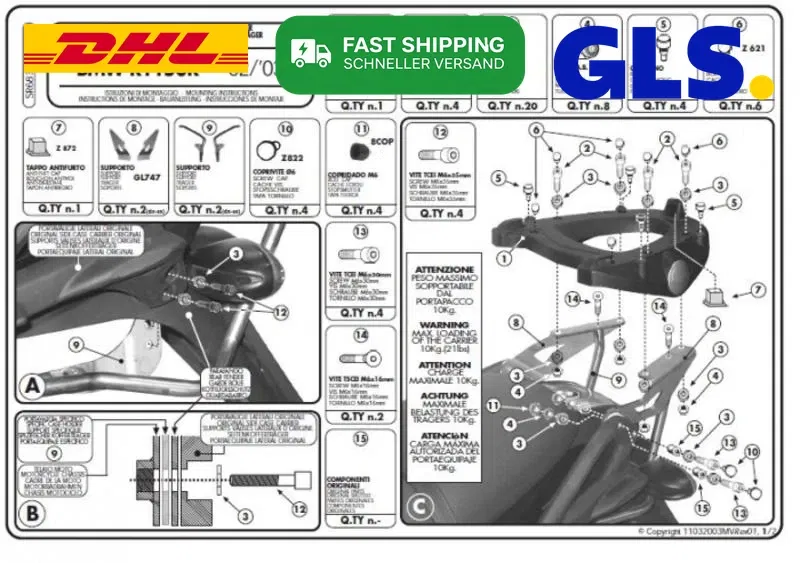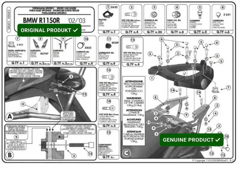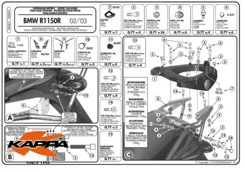 Zasady bezpieczeńśtwa i użytkowania: Stelaż kufra centralnego BMW R 1150R (01-06), R 850R (03-07) ( Z PŁYTĄ MONOKEY ) KAPPA kod ean 8029871059131