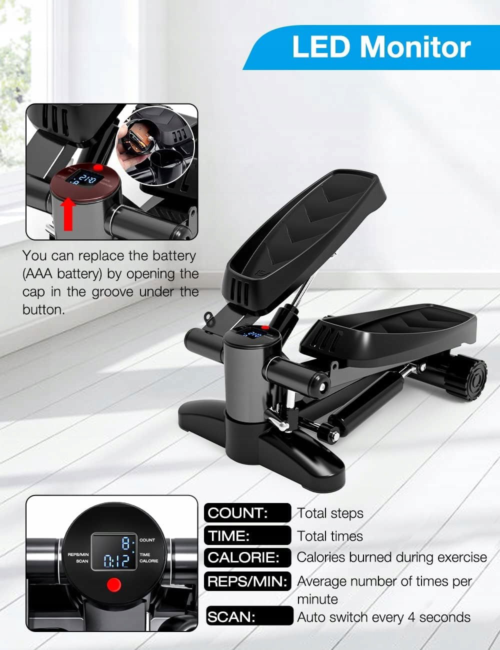Wielofunkcyjny monitor LED - step Swing jest wyposażony w monitor LED, który może wyraźnie rejestrować czas ćwiczeń, częstotliwość ruchu, zużycie kalorii i całkowitą liczbę, dzięki czemu możesz zrozumieć sytuację treningową i zorganizować następny plan treningowy. Wygodne i efektywne wykonywanie ćwiczeń fitness