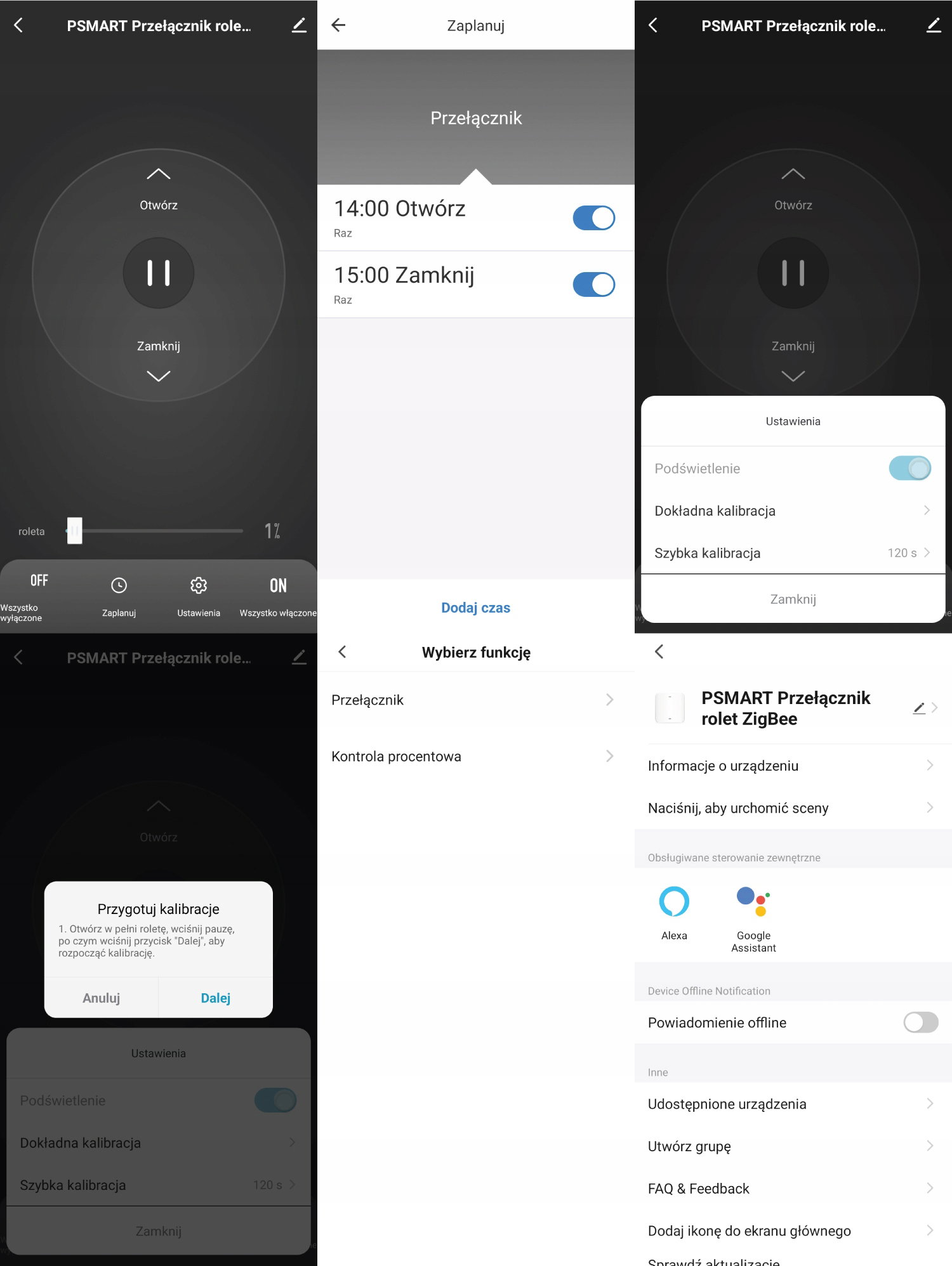 - Szybka kalibracja (możliwość podania czasu otwarcia rolety w sekundach)