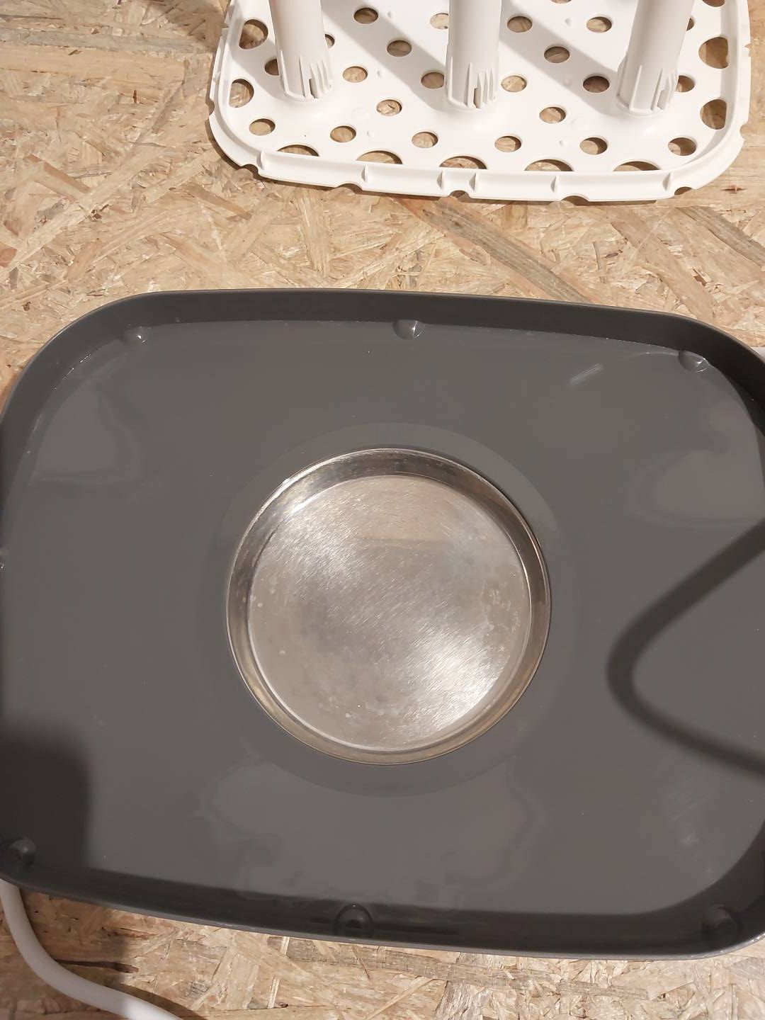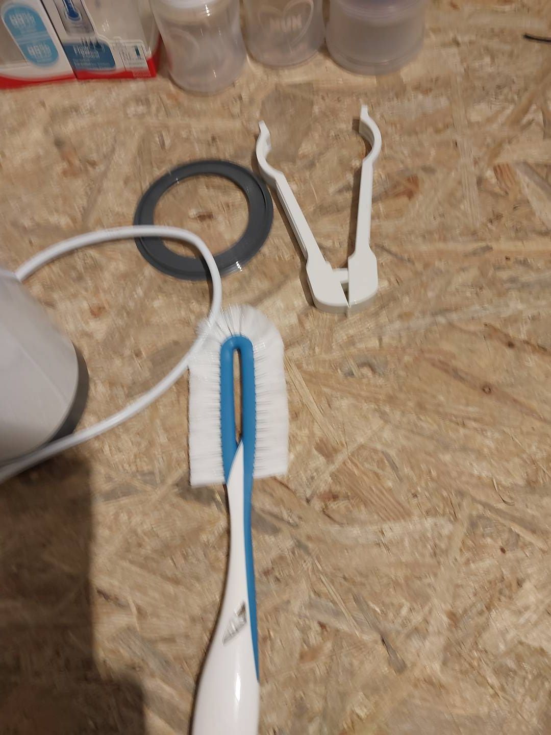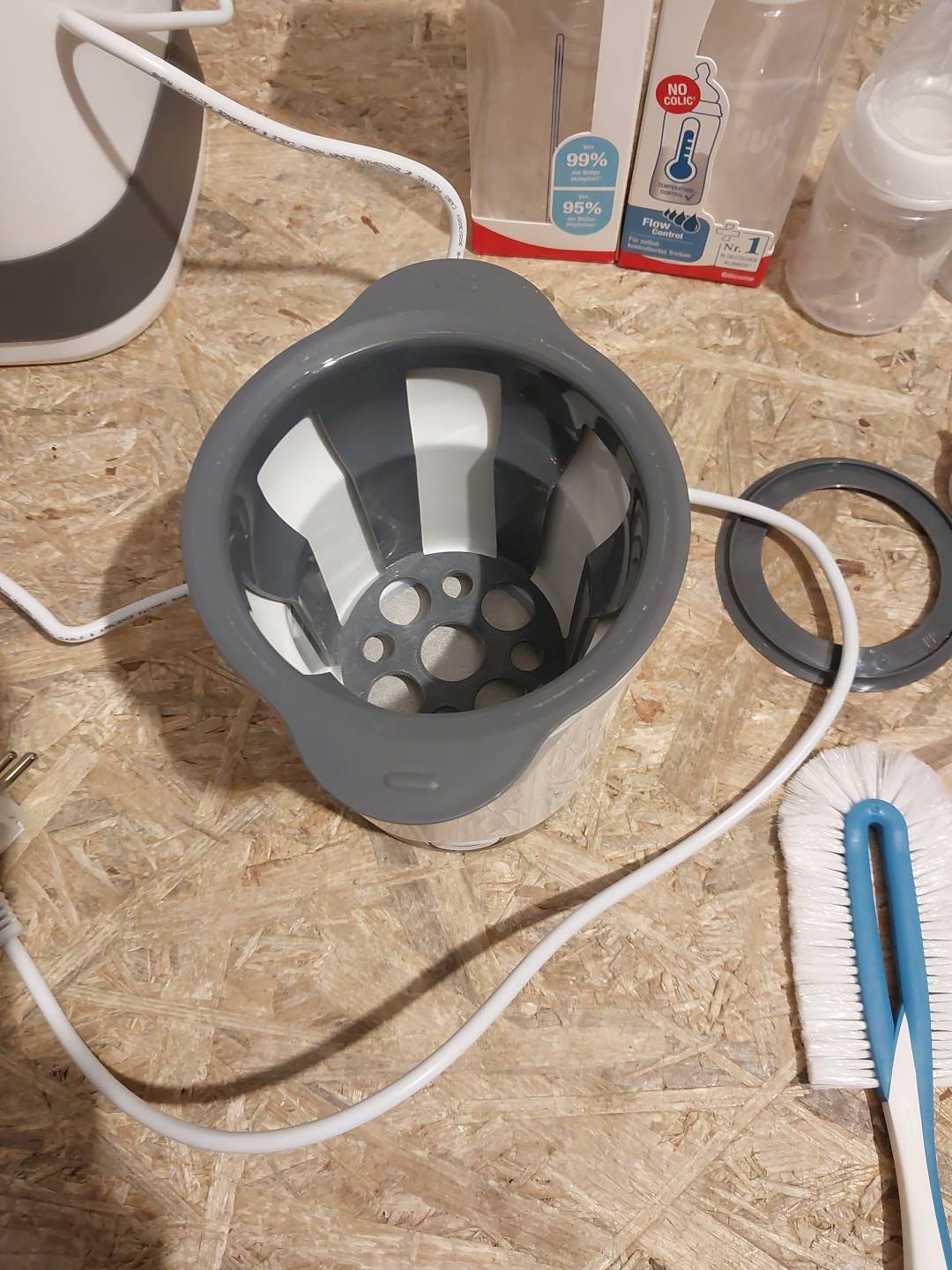 Obrotowa szczotka do butelek ze specjalnym nylonowym włosiem do dokładnego czyszczenia i dozownikiem mleka w proszku składającym się z 3 ustawianych jeden na drugim pojemników.