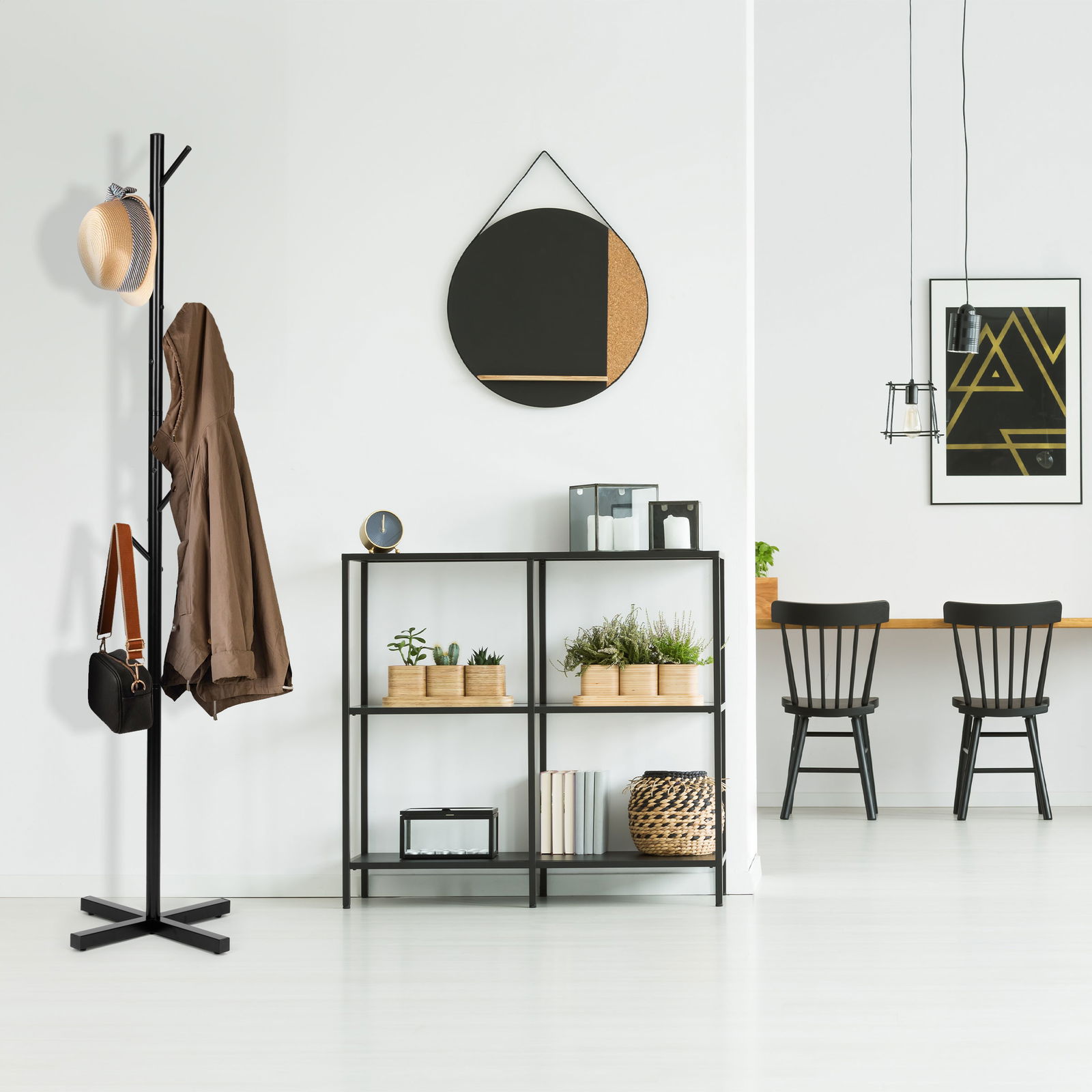 Stojący wieszak na ubrania, to świetne uzupełnienie każdego przedpokoju, garderoby, biura lub szatni. Charakteryzuje go prosta forma, funkcjonalność oraz stabilna konstrukcja, a dzięki uniwersalnemu designowi i formie drzewka, idealnie wpasuje się i uzupełni każdy rodzaj wnętrza.