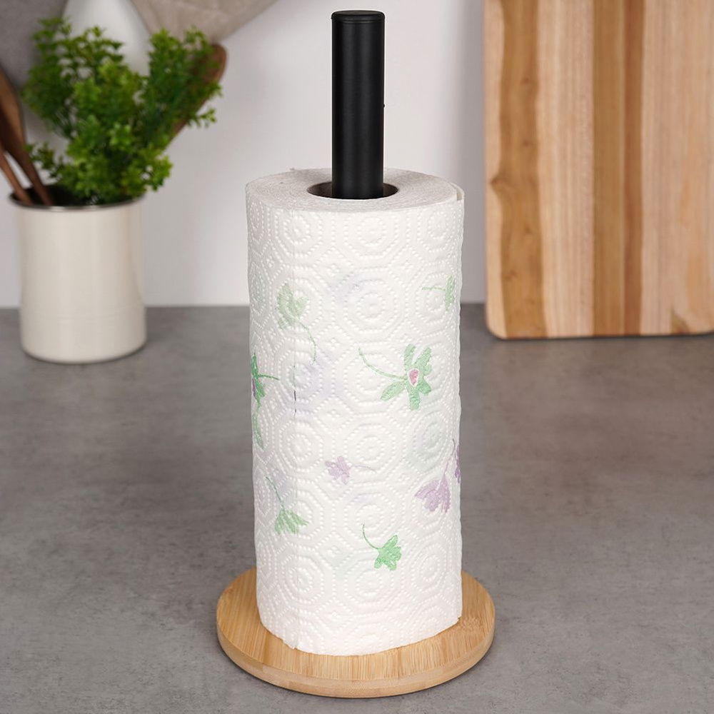 Stojak kuchenny na ręczniki papierowe, ułatwia codzienne czynności i utrzymanie porządku w kuchni. Solidnie wykonany z wytrzymałych materiałów. Stojak utrzymany w modnym połączeniu czarnego koloru z drewnem, więc efektownie prezentuje się w każdym wnętrzu. Pozwoli nam na wygodne korzystanie i przechowywanie ręczników. Przydatny w każdej kuchni. Zapewnia łatwe i wygodne wyrywanie arkuszy ręcznika, dzięki czemu można szybko i sprawnie wyczyścić powierzchnie czy ręce bez konieczności szukania i rozwijania całej rolki.