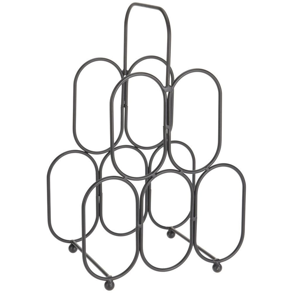 Praktyczny stojak na 5 butelek wina lub innych alkoholi. Stojak ma wymiary 40,5 x 27 cm. Wykonany z wysokiej jakości metalu w kolorze czarnym. Z jego pomocą w oryginalny sposób wyeksponujesz wino lub inne trunki zachowując odpowiednią pozycję przechowywania. Będzie idealnie pasował do każdego wnętrza. Świetny pomysł na prezent np. z okazji parapetówki.