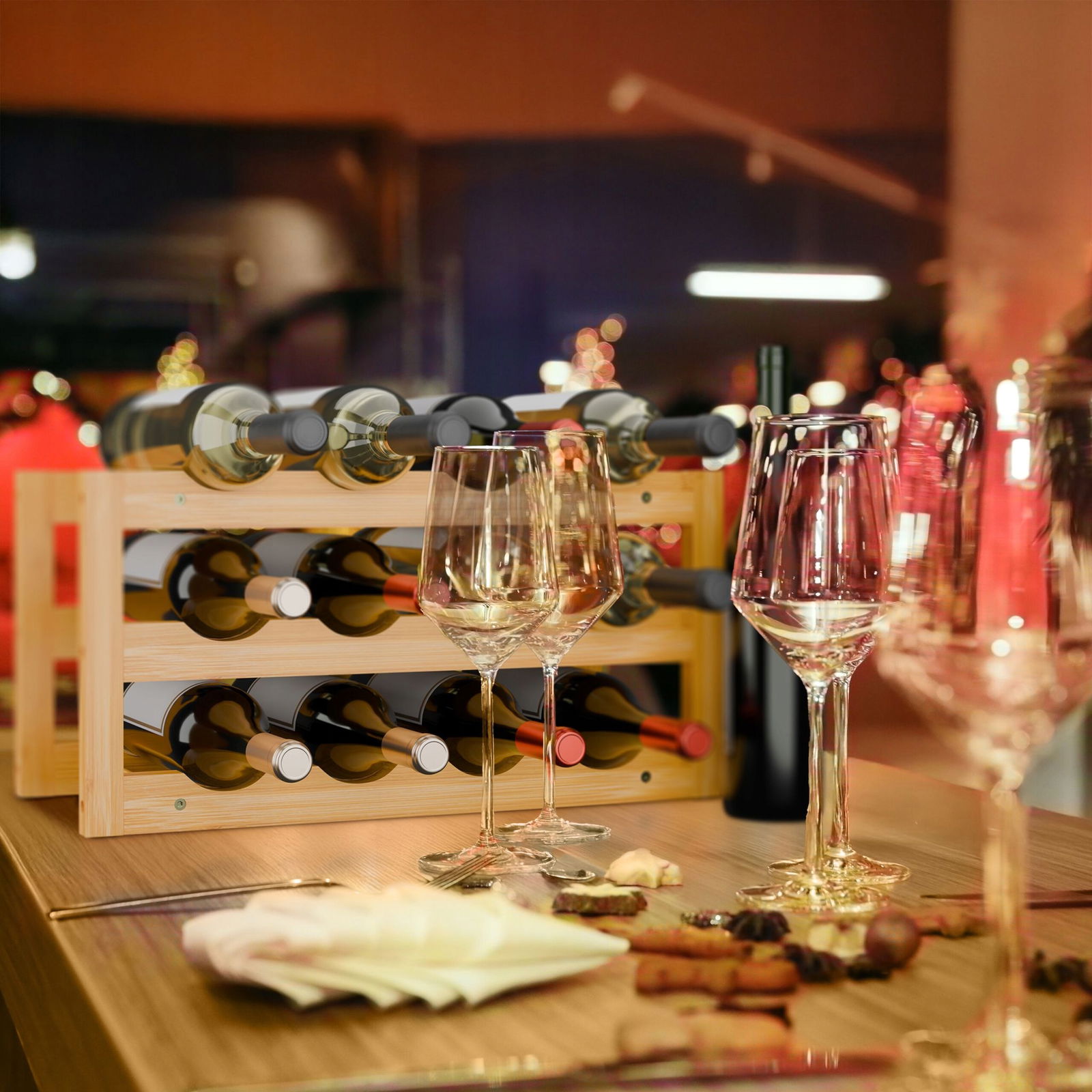 ⭐Poziome przechowywanie butelek zapobiega wysychaniu korków, dzięki czemu wino zachowuje swoje właściwości i aromat. Naturalna, bambusowa konstrukcja nadaje stojakowi ciepły i stylowy charakter. Doskonale prezentuje się na blacie kuchennym, ladzie lub w domowym barku.