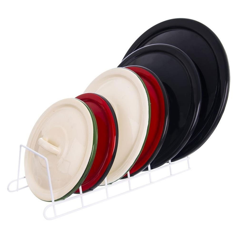 Organizer do przechowywania sześciu pokrywek lub talerzy. Możemy przechowywać go na blacie lub umieścić w szafce czy głębokiej szufladzie. Dzięki niemu zarówno pokrywki jak i talerze będą przechowywane w pozycji pionowej. Organizer pomoże nam uniknąć bałaganu w szufladach, który powodują rozrzucone pokrywki. Łatwy w czyszczeniu. Klasyczny wzór i kolorystyka sprawią, że pasuje do każdej kuchni.
