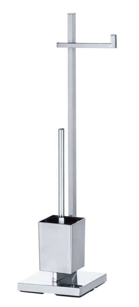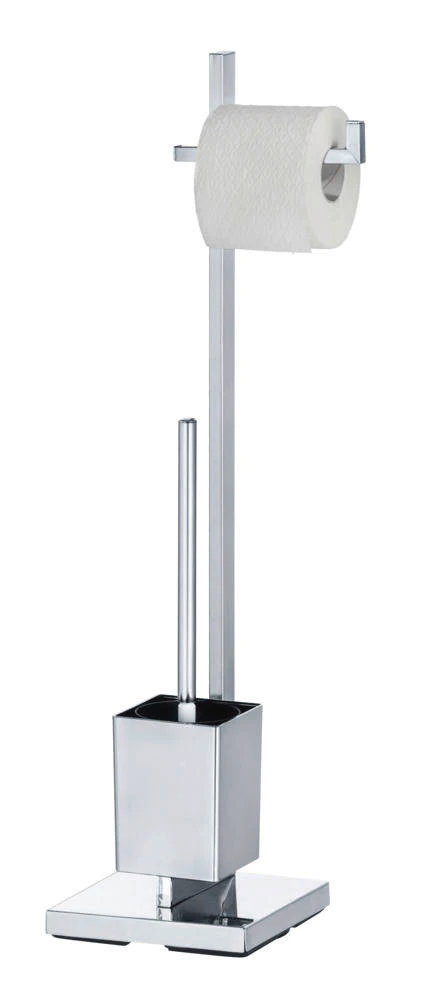 Elegancki stojak łazienkowy łączy w sobie uchwyt na papier toaletowy oraz pojemnik na szczotkę do WC.